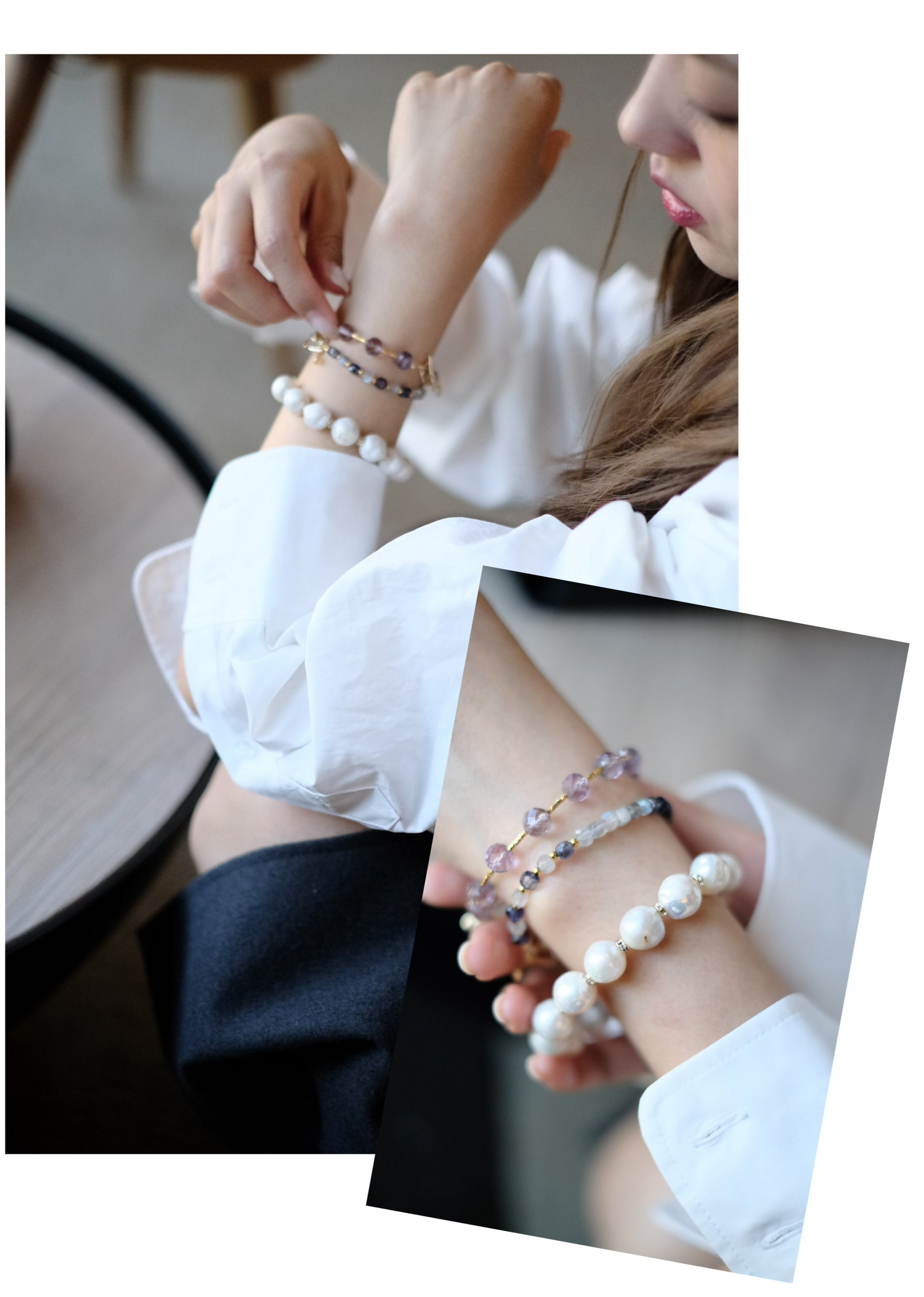 1. Natural Materials: We use natural pearls and crystals as our primary materials. These materials are not only beautiful but also carry unique energies. For example, yellow crystals attract wealth, blue crystals help with expression and inner calmness, and pink crystals symbolize self-love and love.
