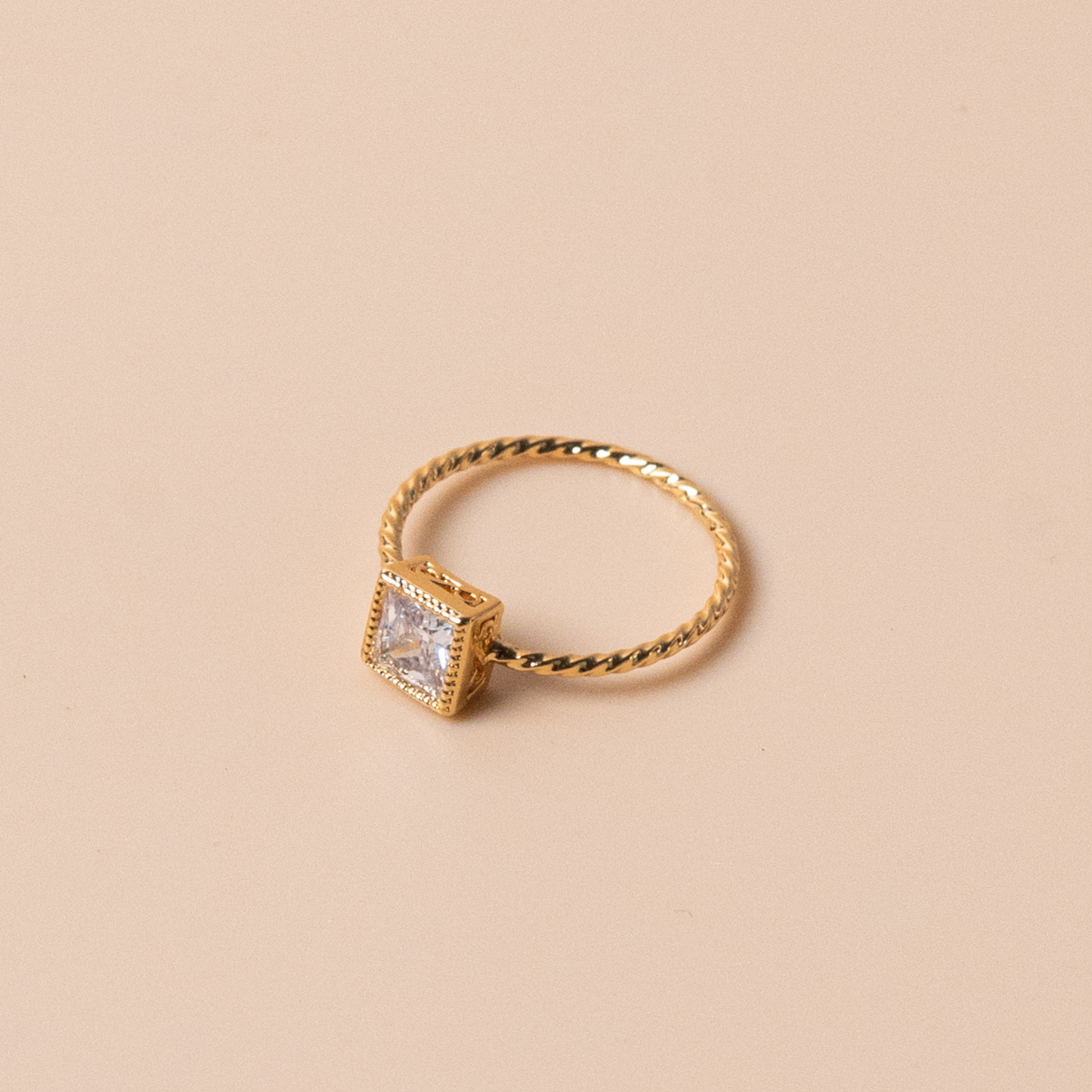 • The square crystal paired with the spiral-patterned band makes it unique. The ring is plated with 24k gold, so it can be worn even while showering.