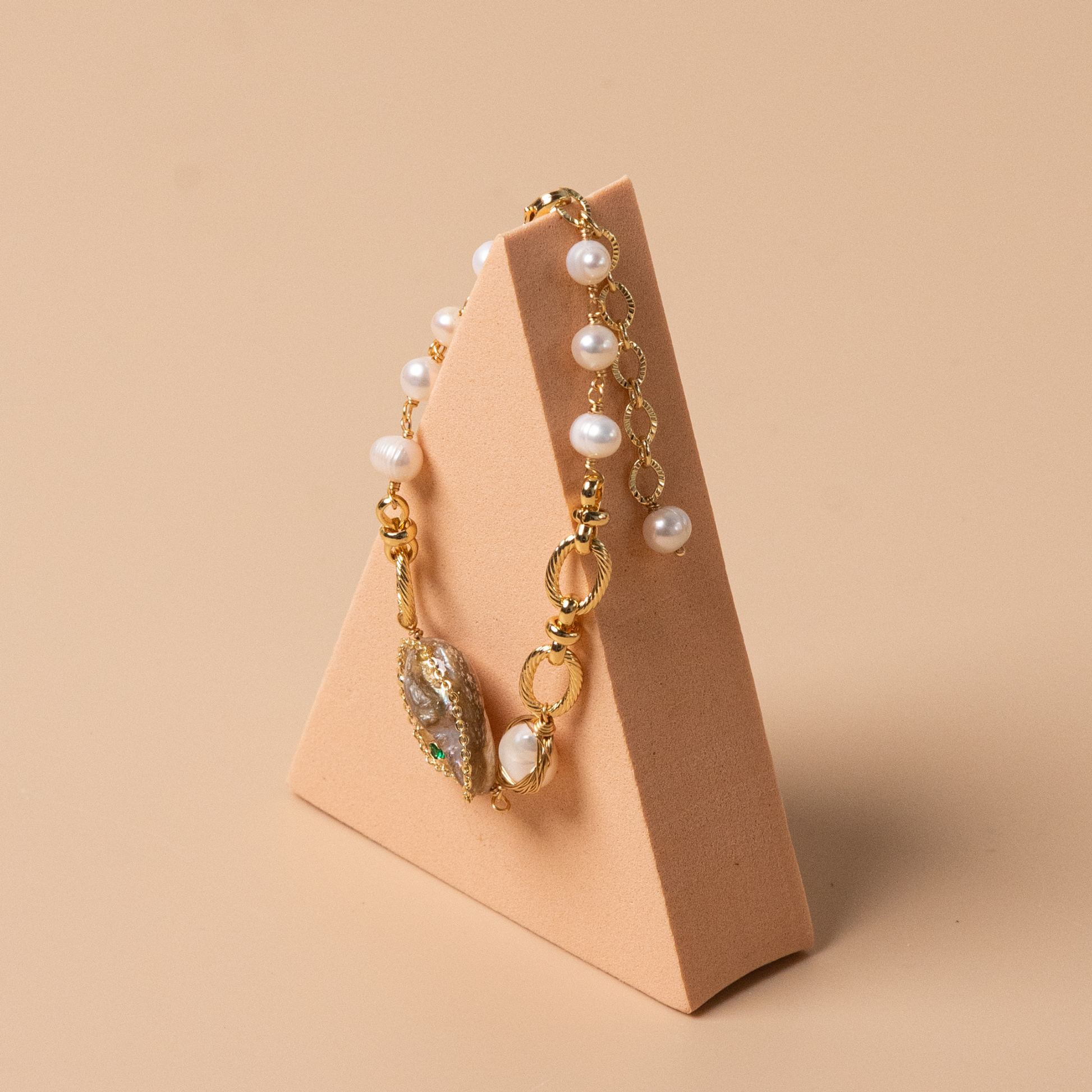 • Natural materials: baroque pearl, freshwater pearls; 14k gold-plated brass.