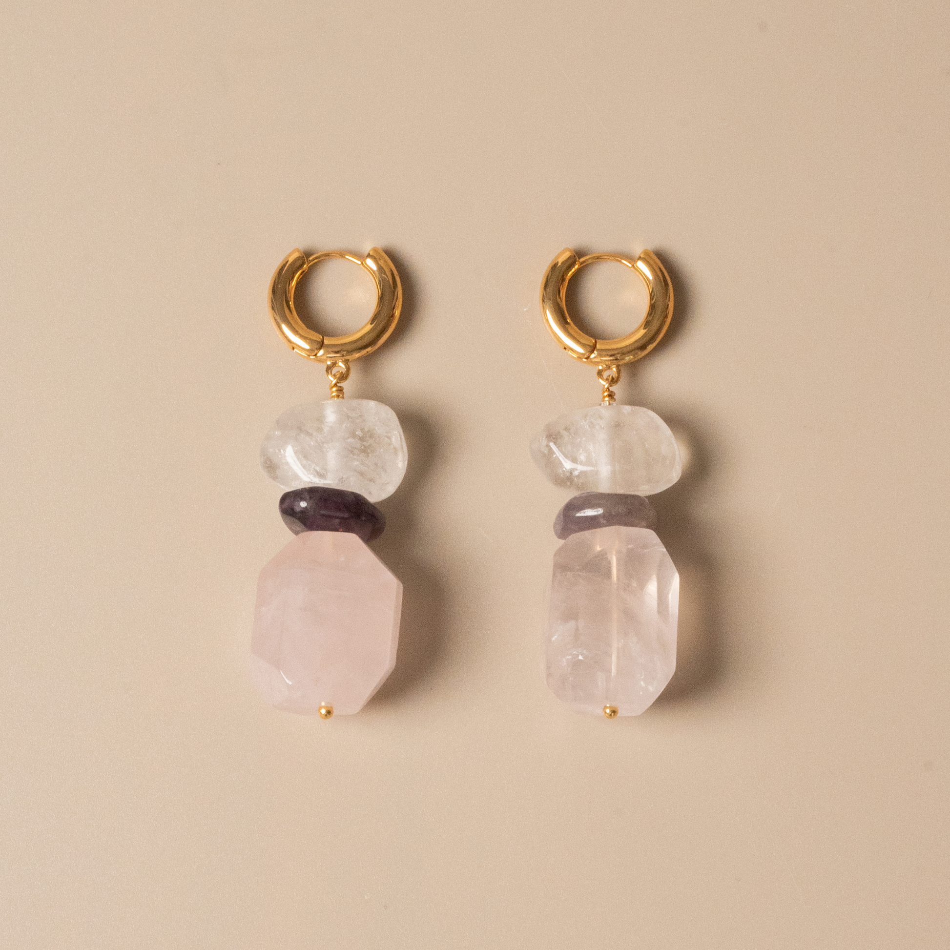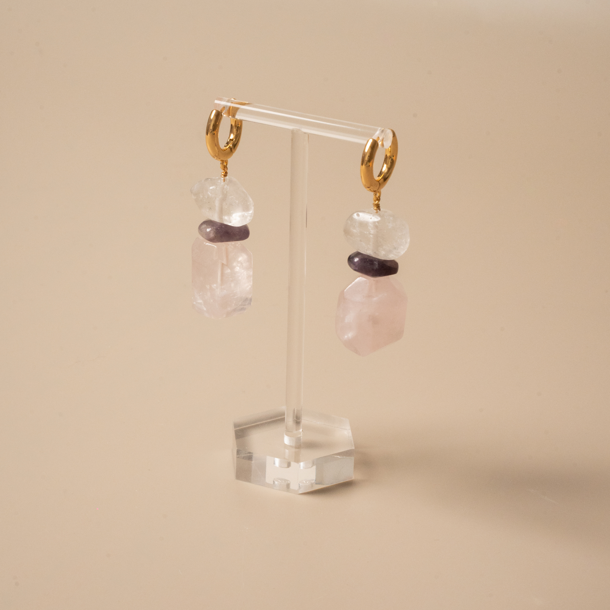 • These earrings are made from a variety of gemstones, including rose quartz, clear quartz, and amethyst. Wearing these stones near the head (like in earrings) is believed to subtly influence your emotional and mental states throughout the day.