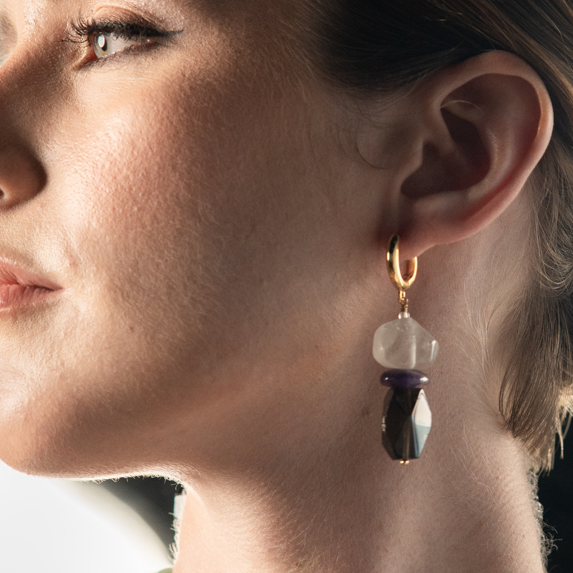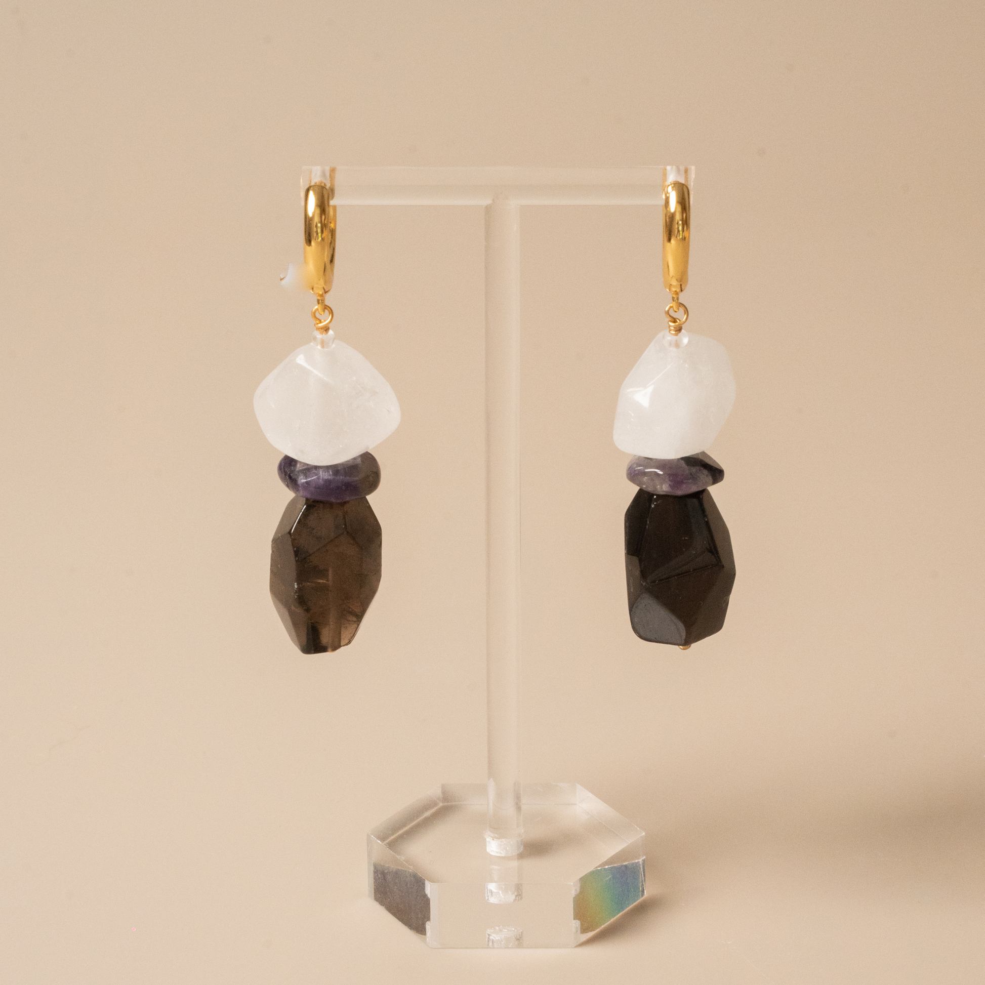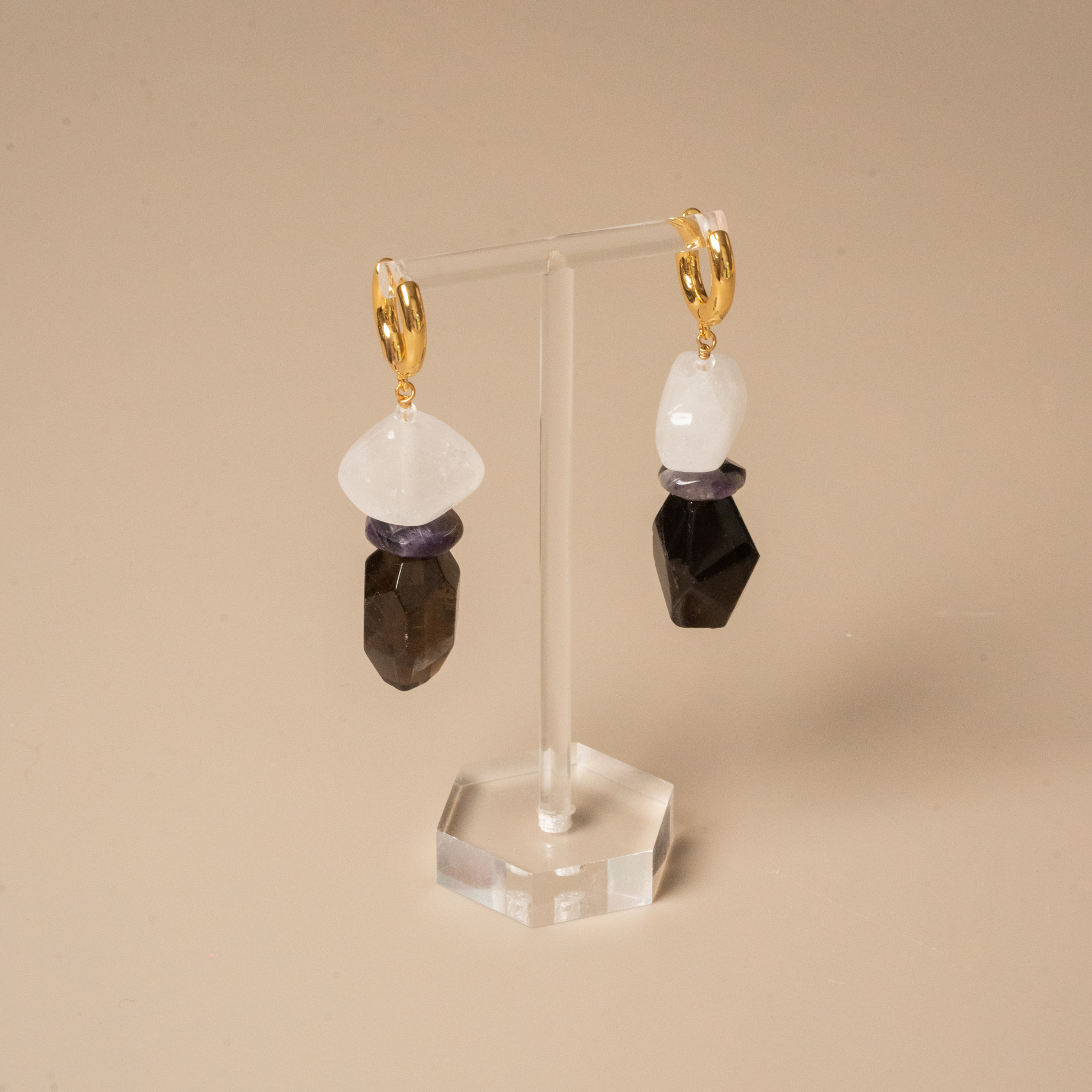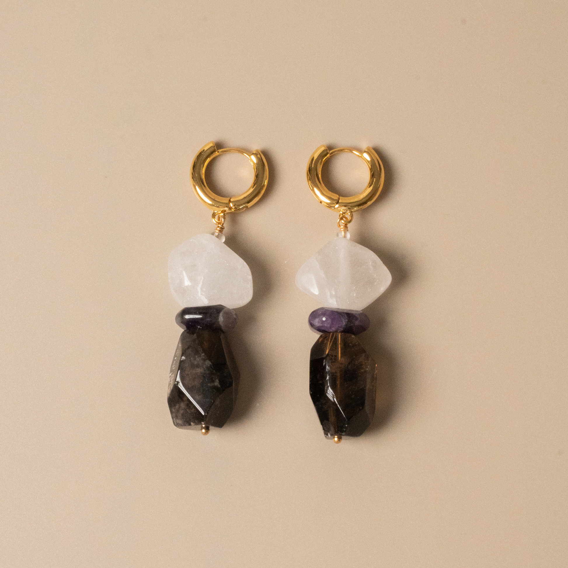 • This is a pair of earrings made with black tourmaline, amethyst, and clear quartz. In metaphysical beliefs, black tourmaline is known for its protective and empowering properties, while clear quartz carries cleansing and healing energy. The combination of these stones can help enhance your strength and confidence. The design concept behind using natural stones is to create harmony and unity between us and nature.