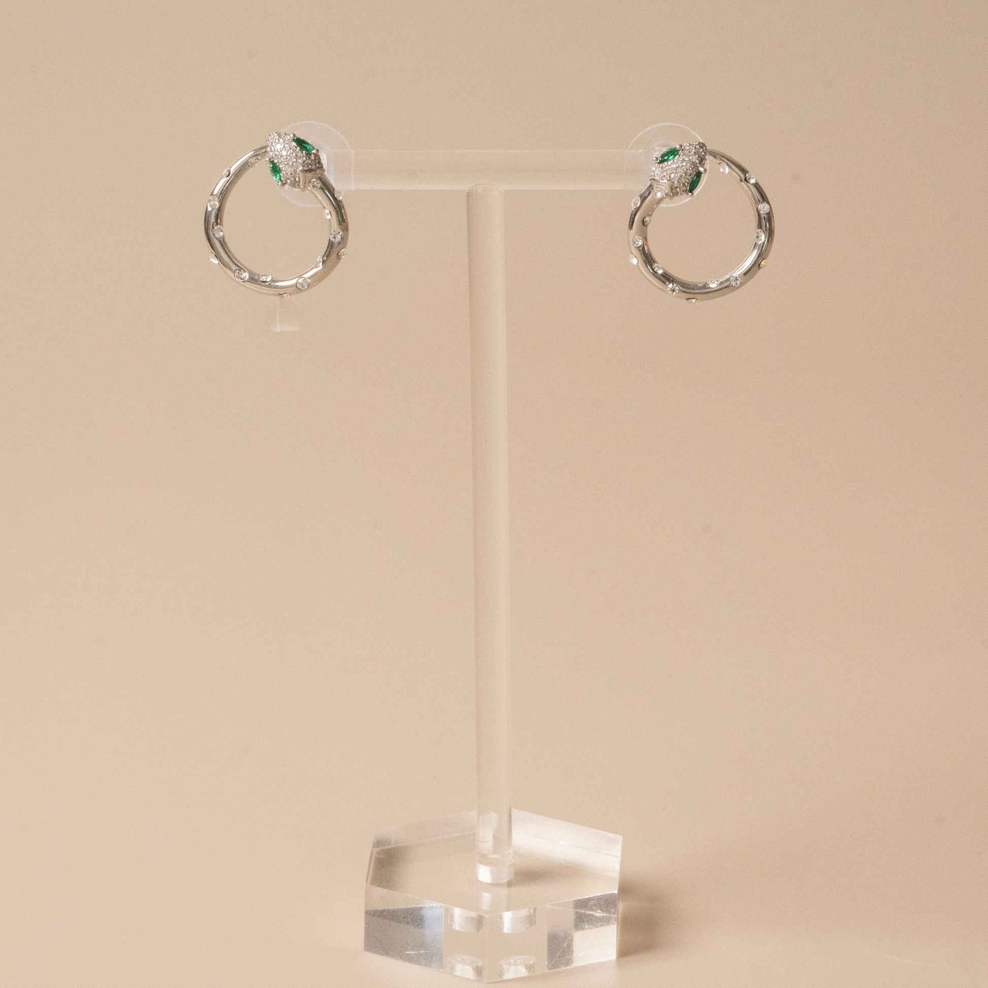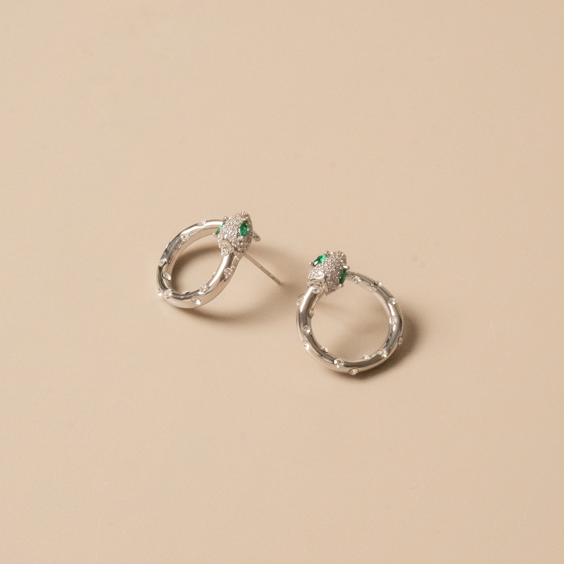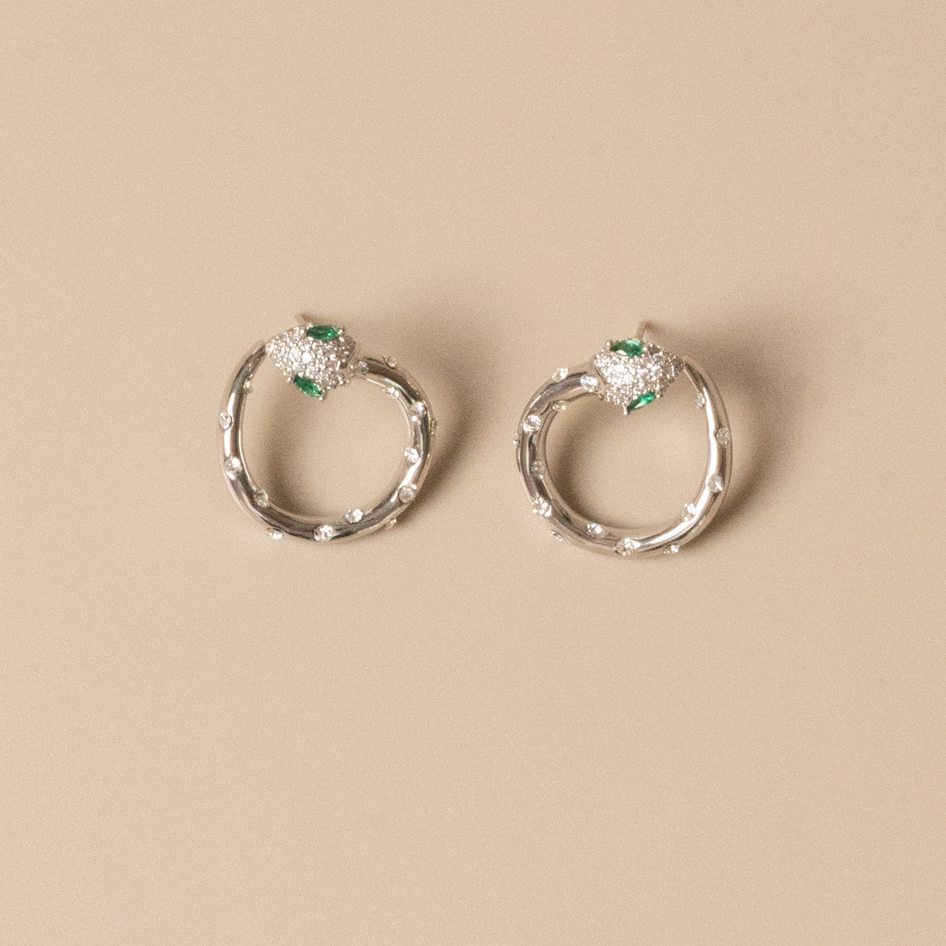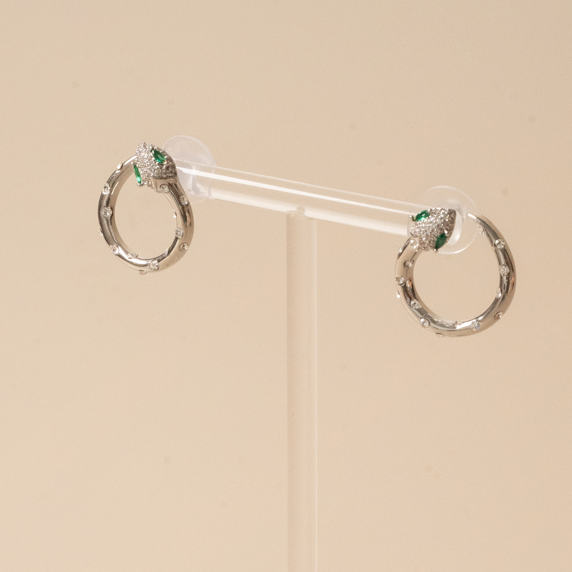 • A sleek twist on timeless hoops—these silver snake-inspired earrings sparkle with pavé details and striking green eyes. Bold yet refined, they bring a touch of mystery and sophistication to any look, perfect for day-to-night style.