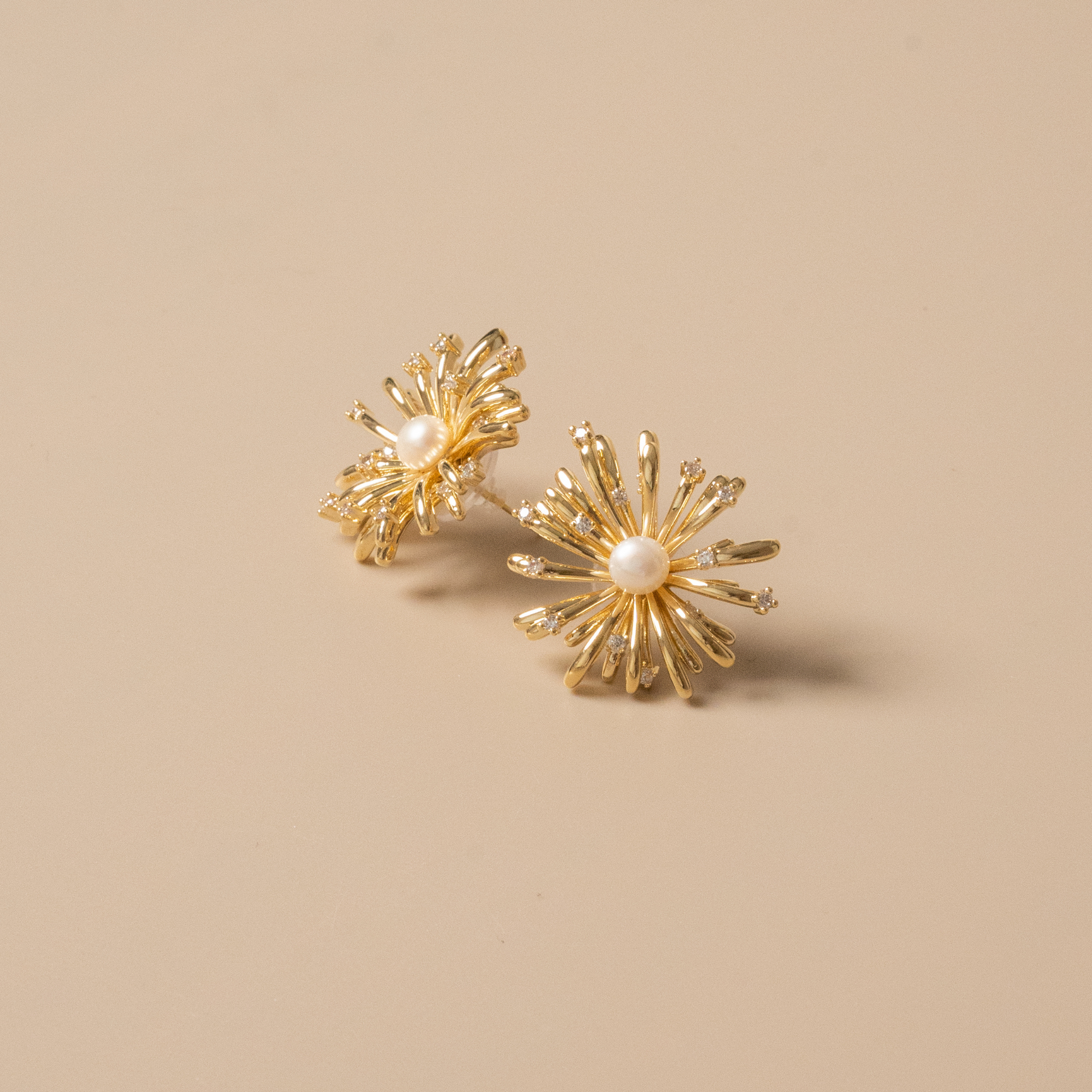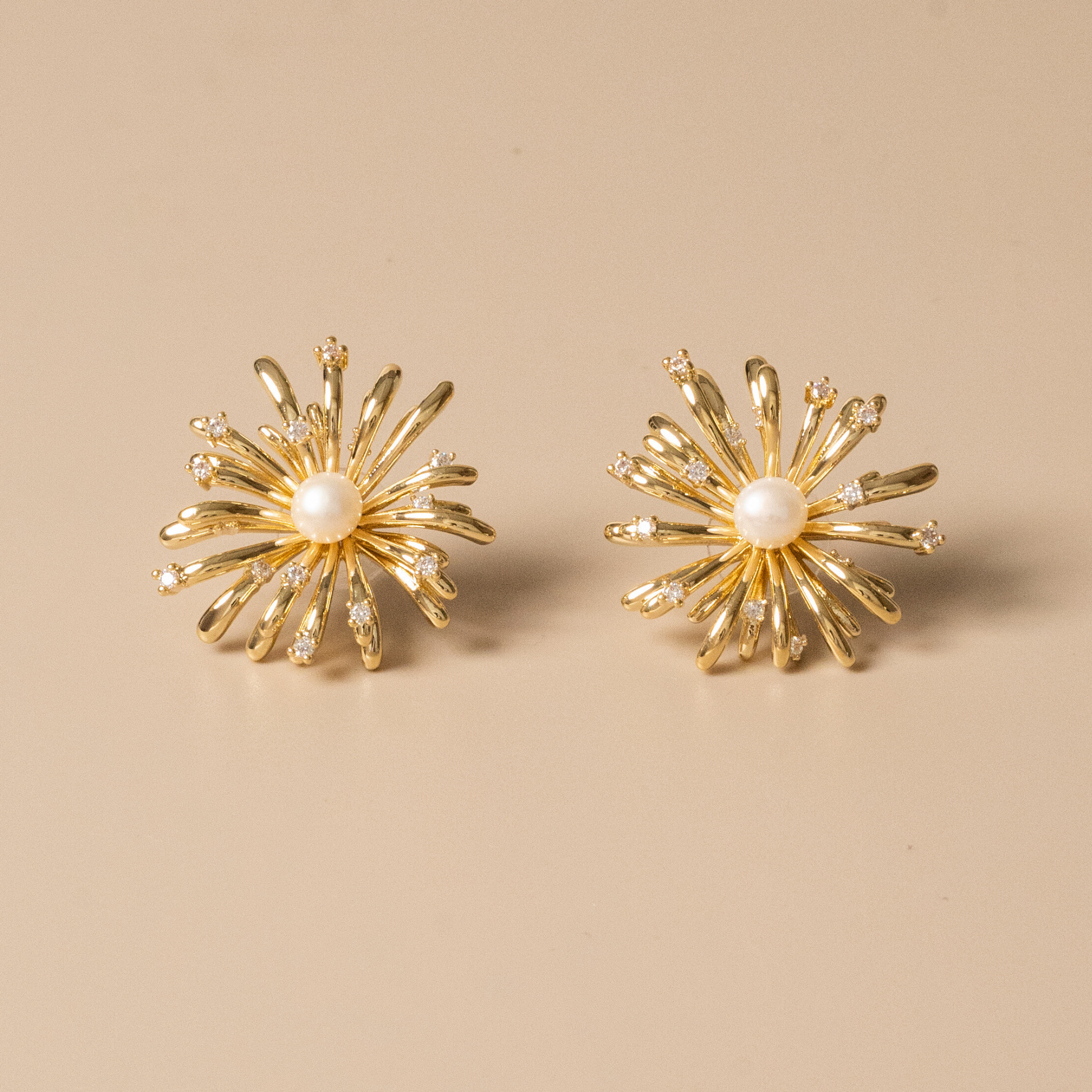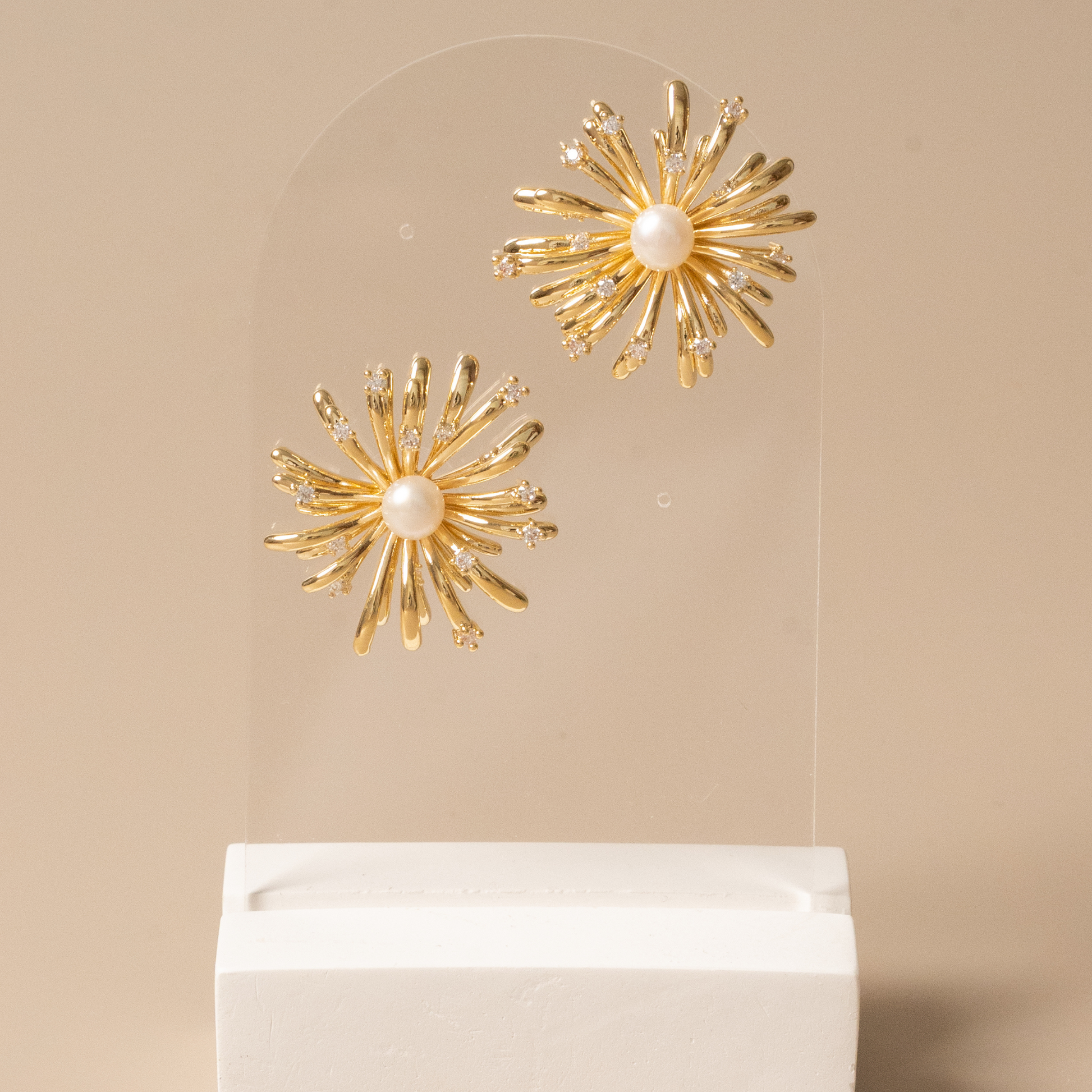 • These golden bursts are accented with sparkling crystals and a luminous pearl at the center. A dazzling statement piece that brings glamour and sophistication to any look.