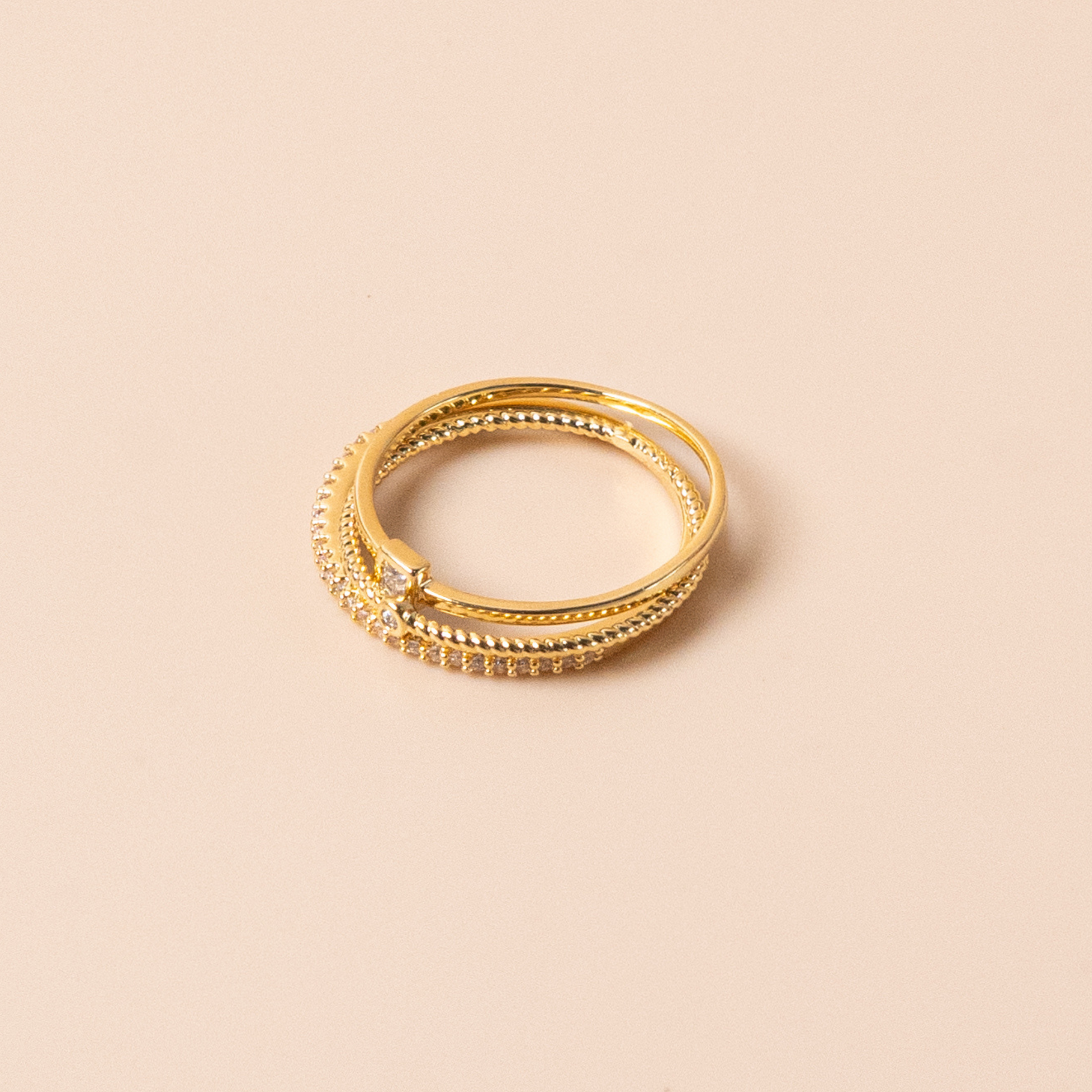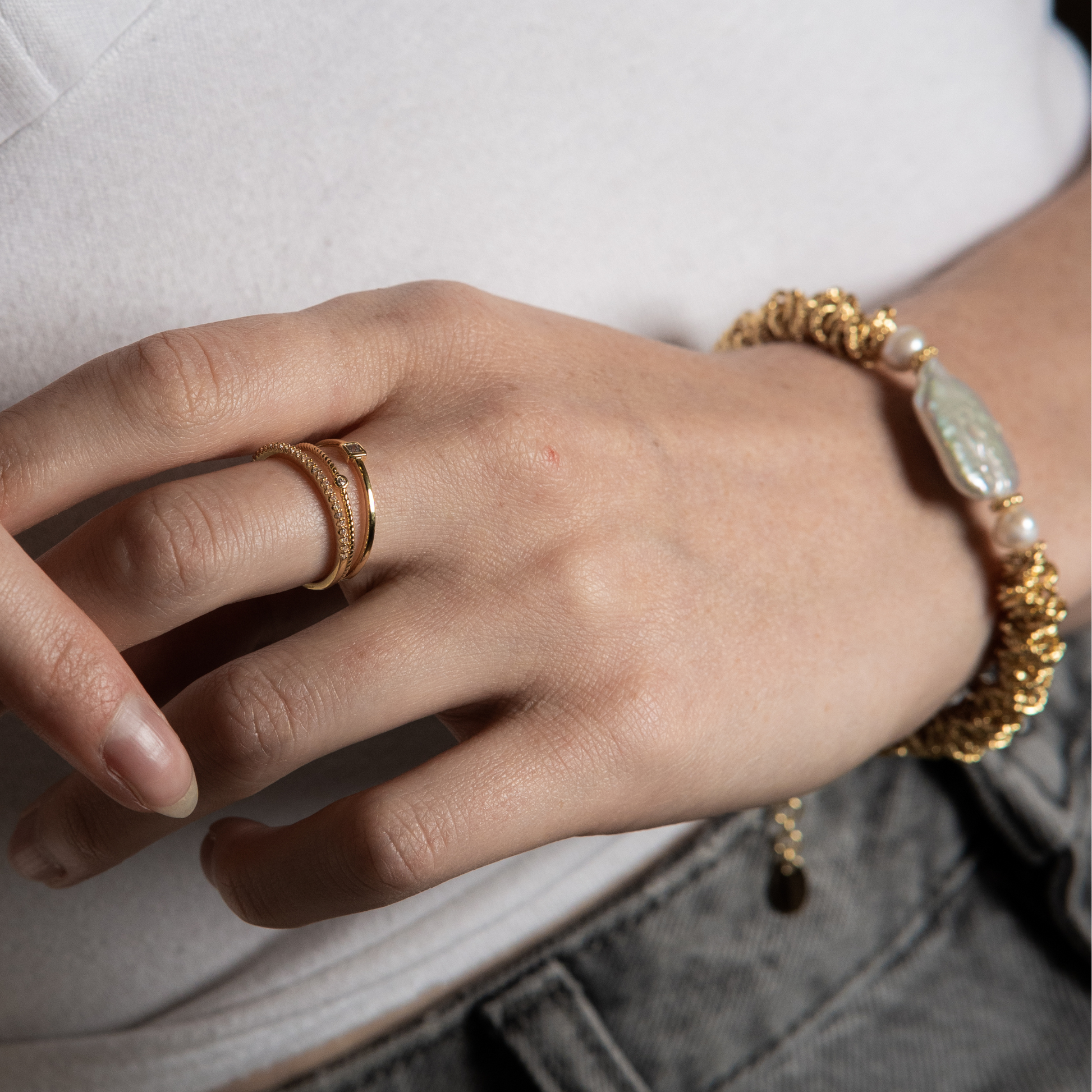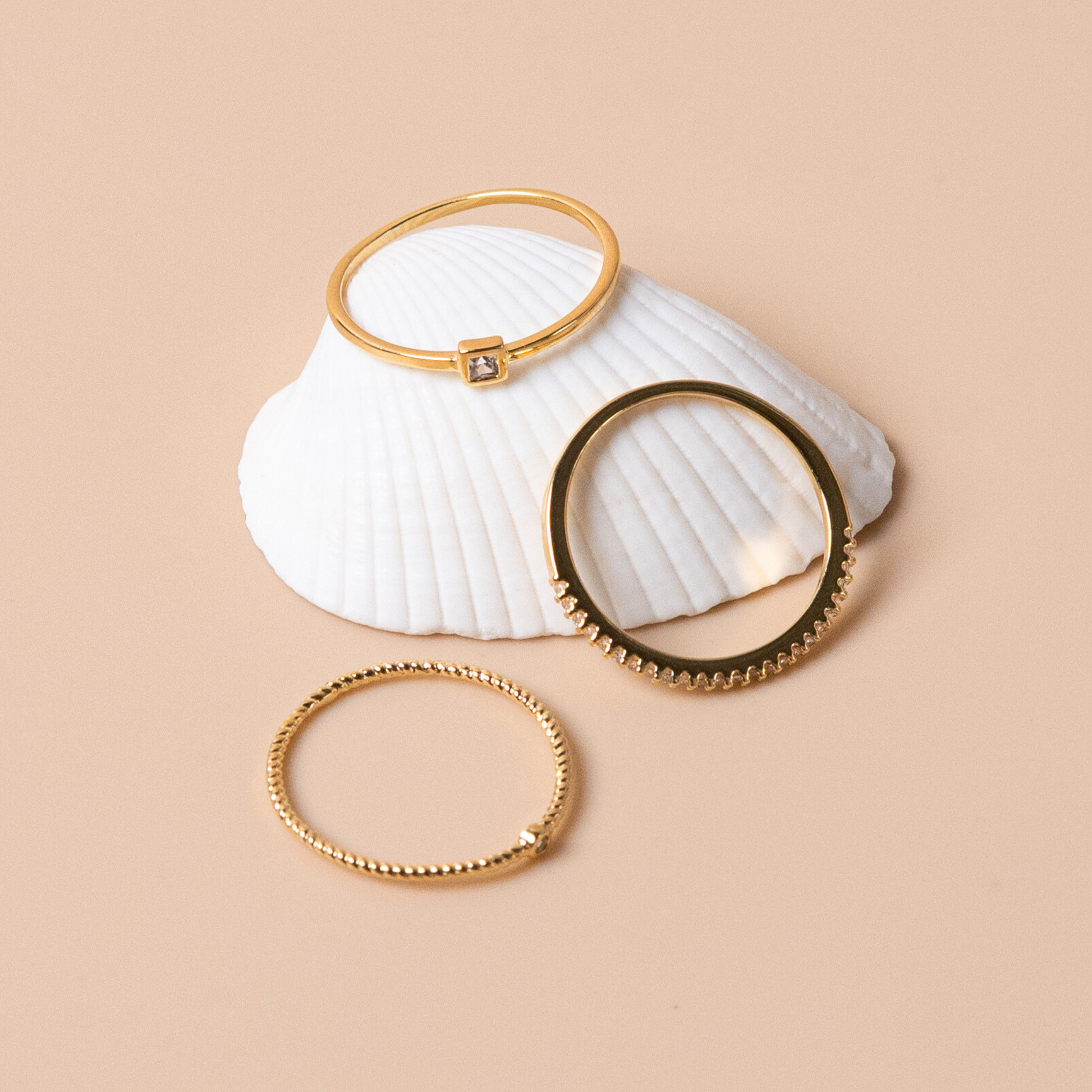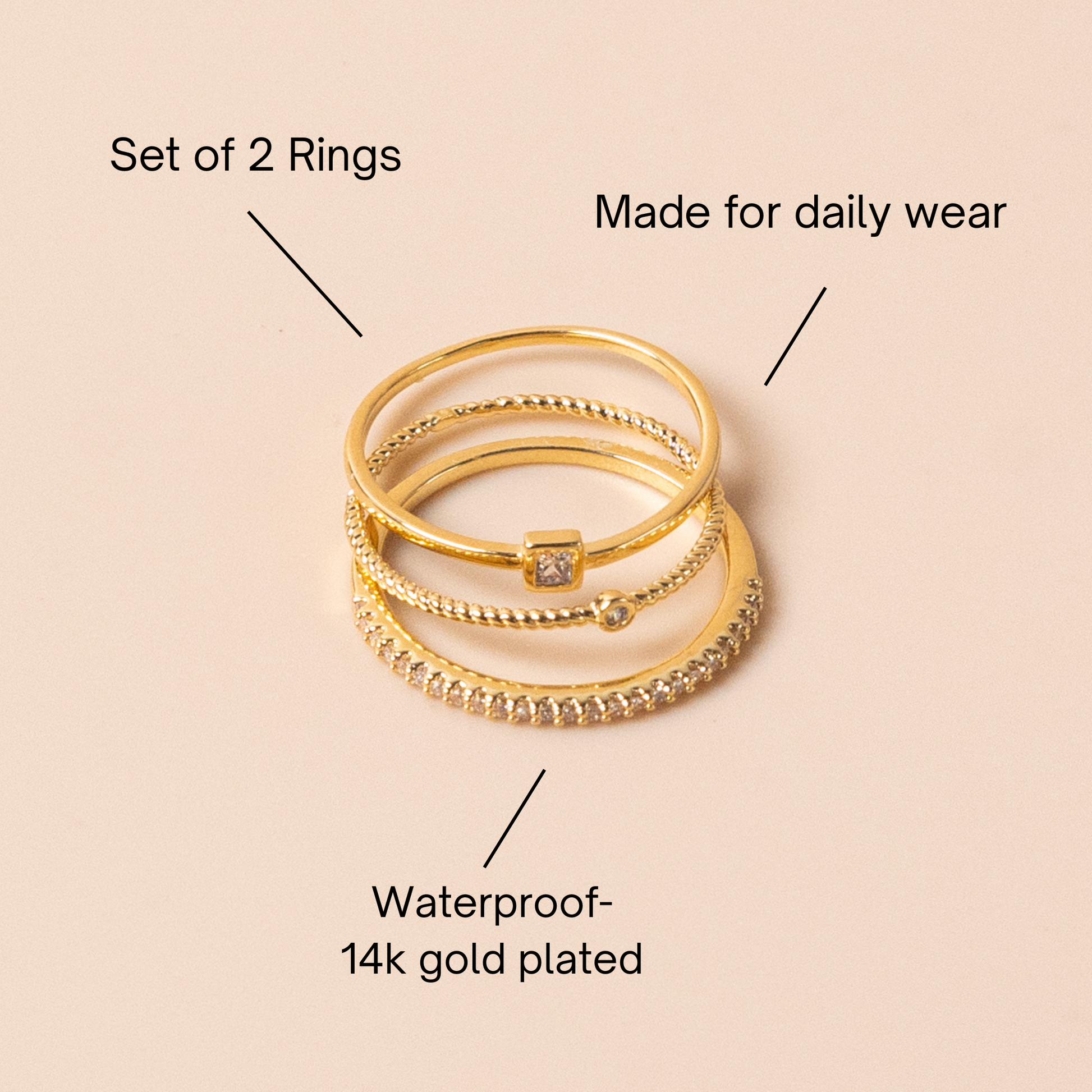 • A set of three delicate stacked rings that can be worn together or on different fingers. The rings are waterproof, making them suitable for daily wear. However, to maintain their gold plating, it's best to avoid contact with hand sanitizer.