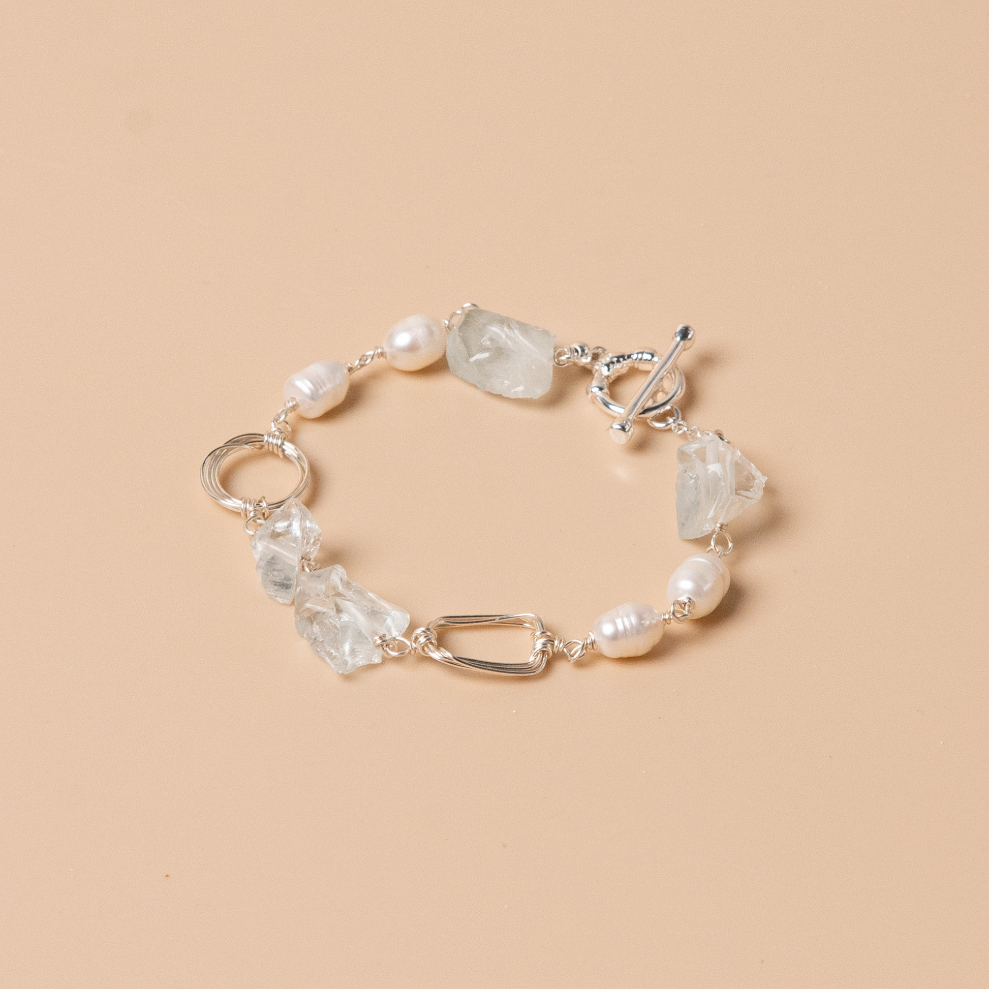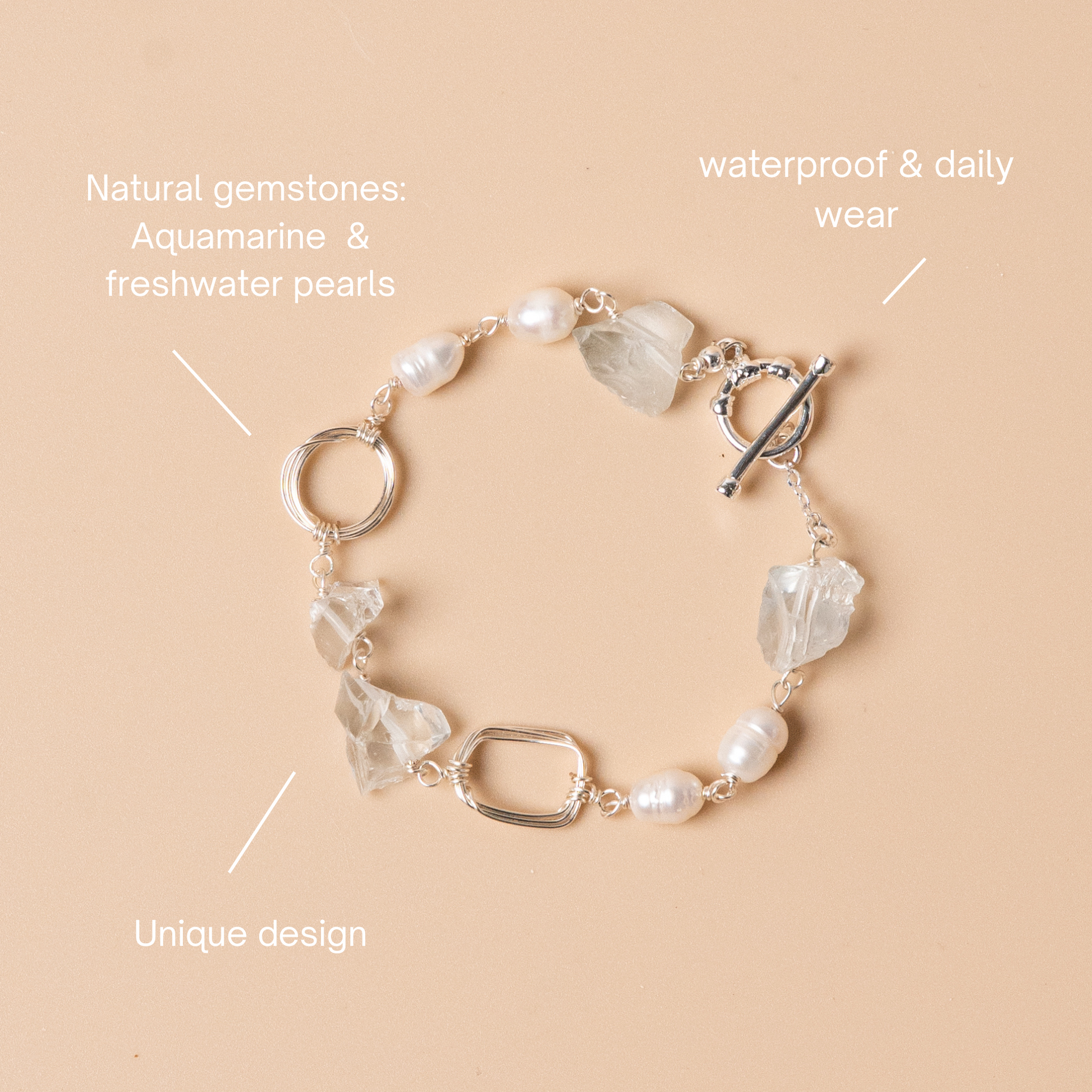 • Raw gemstone: aquamarine; freshwater pearls; white gold plated brass.