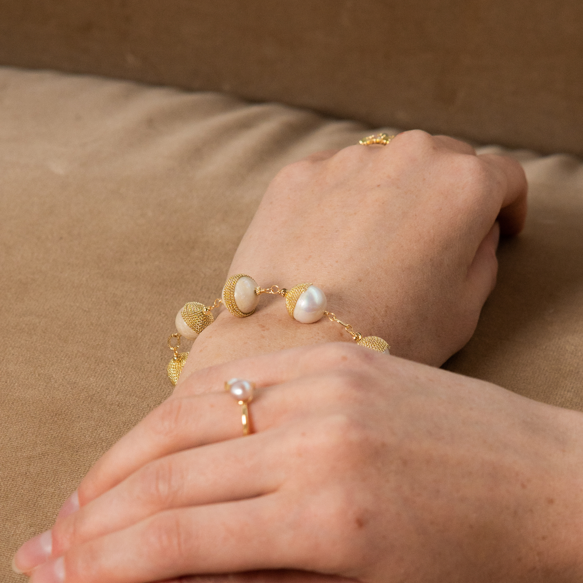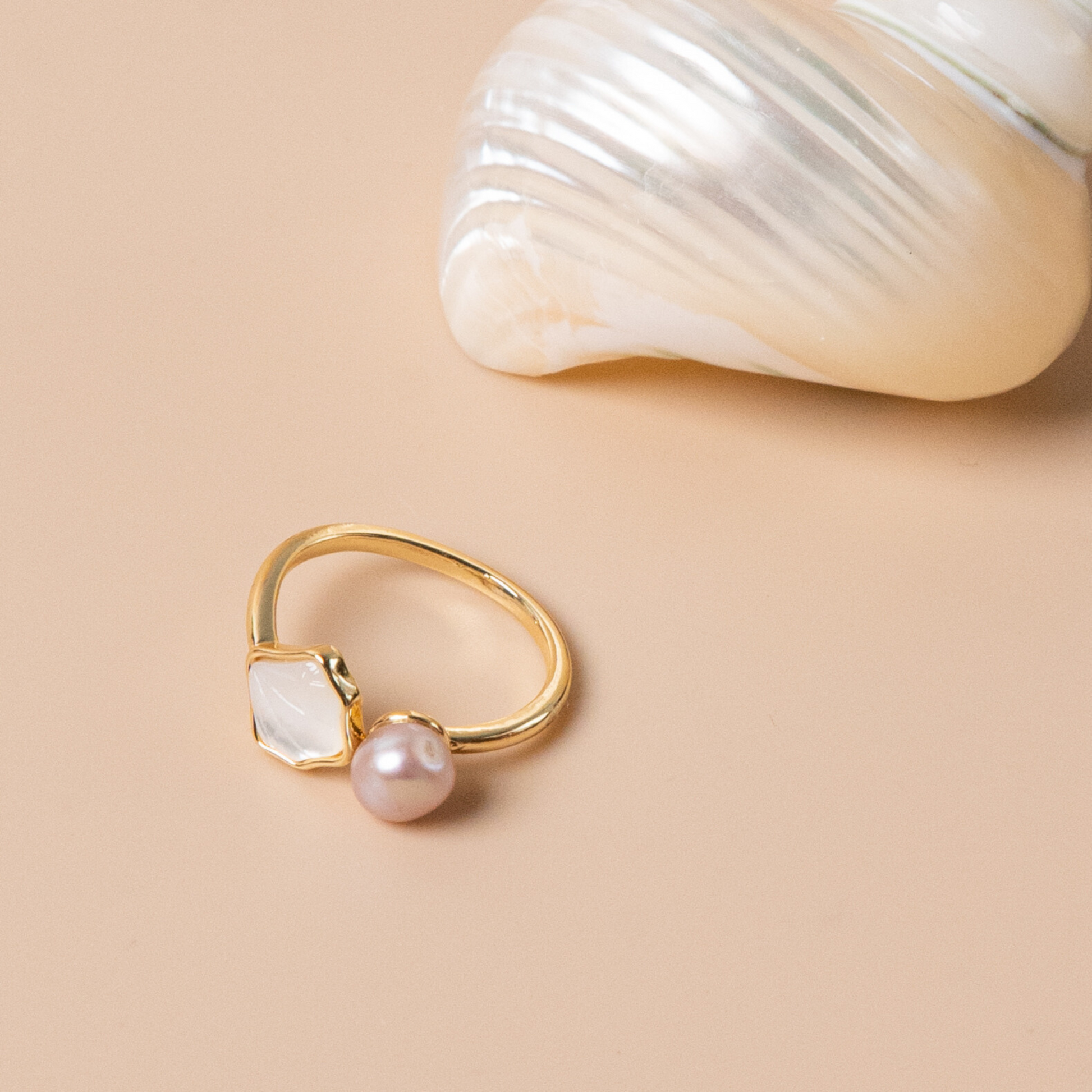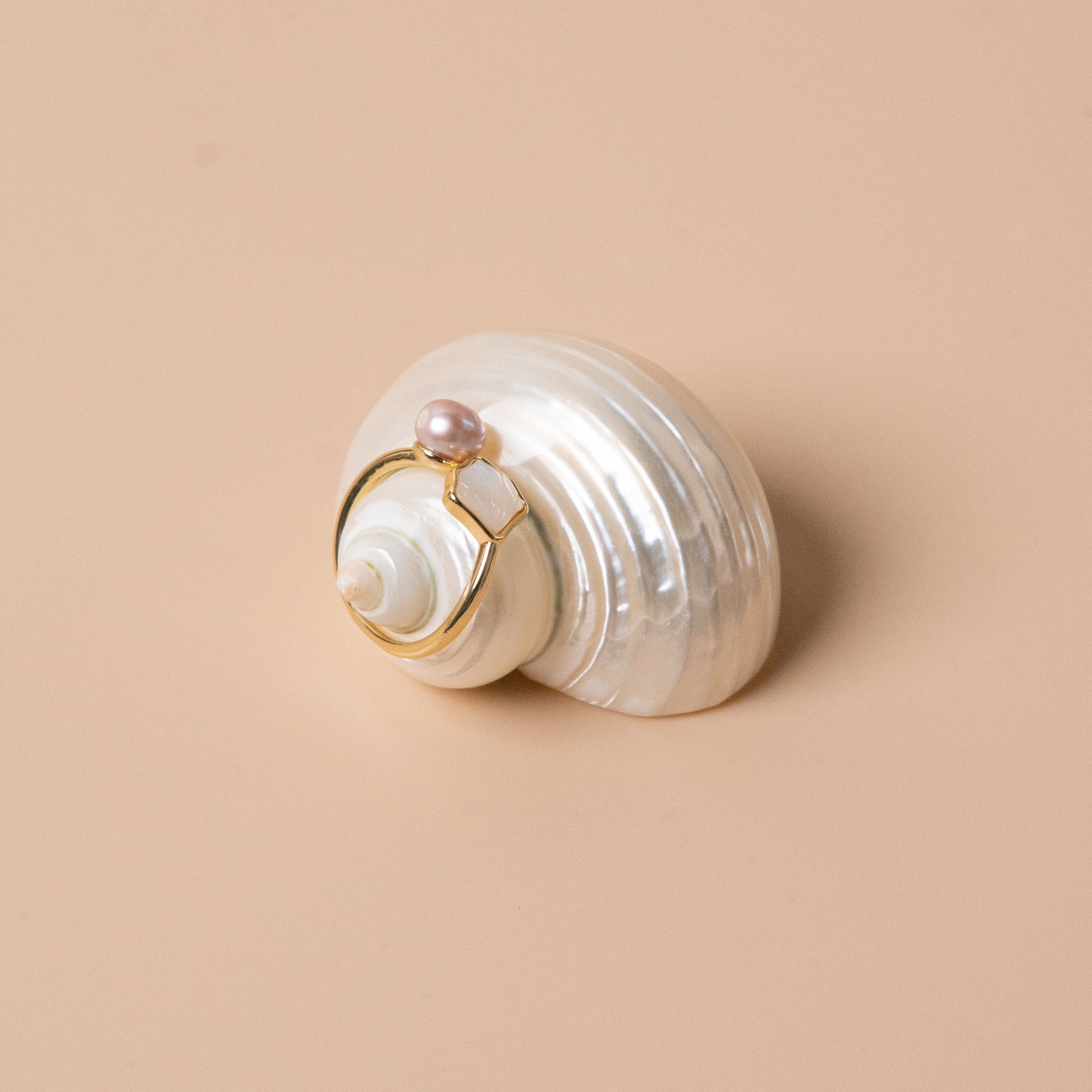 • This is a very feminine ring, designed with light pink pearls and shells. It's both fun and versatile — you can wear it while traveling or at the office.