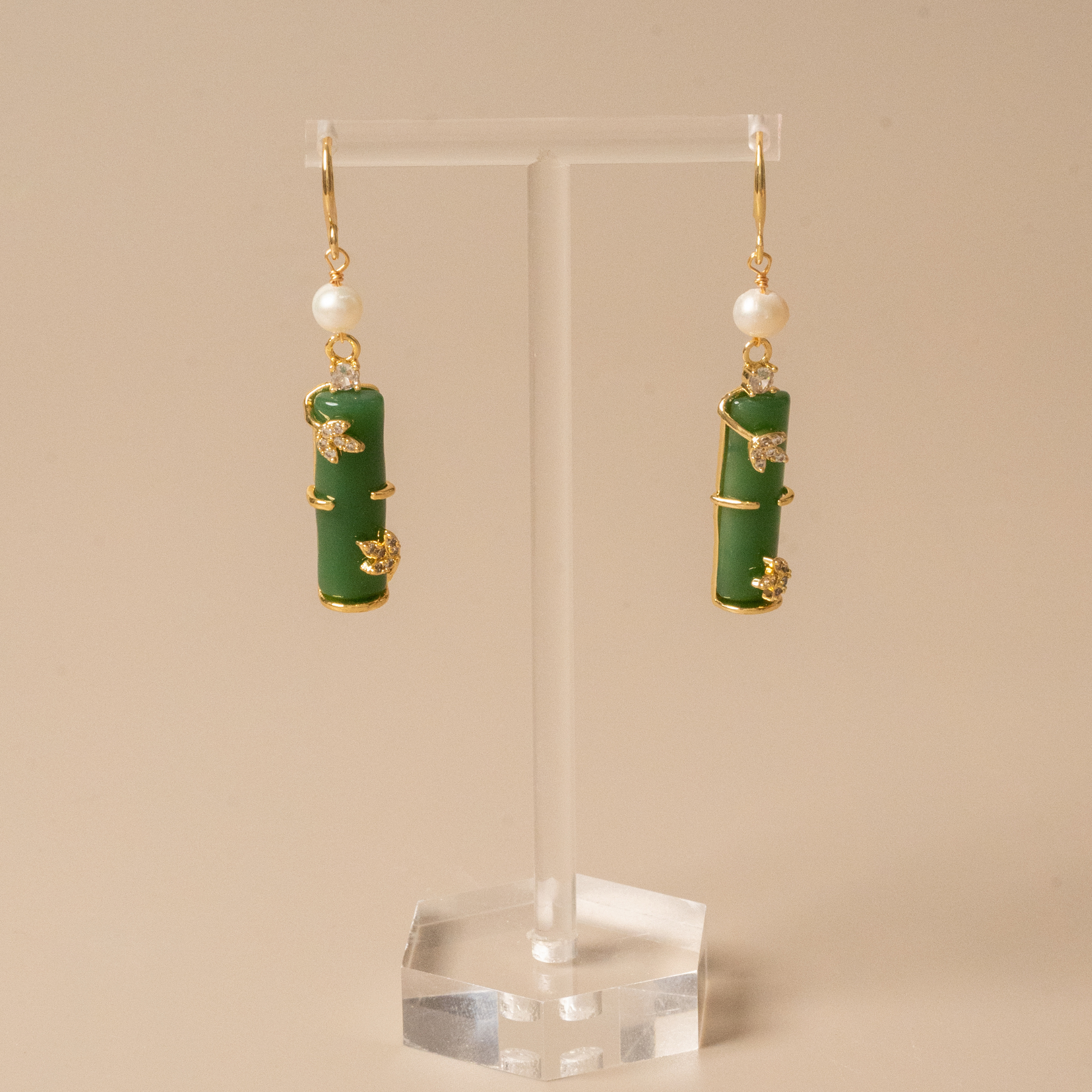 • Inspired by nature, these earrings feature green bamboo-shaped drops adorned with golden details and a pearl. A symbol of strength and grace, this is also the spirit of bamboo.