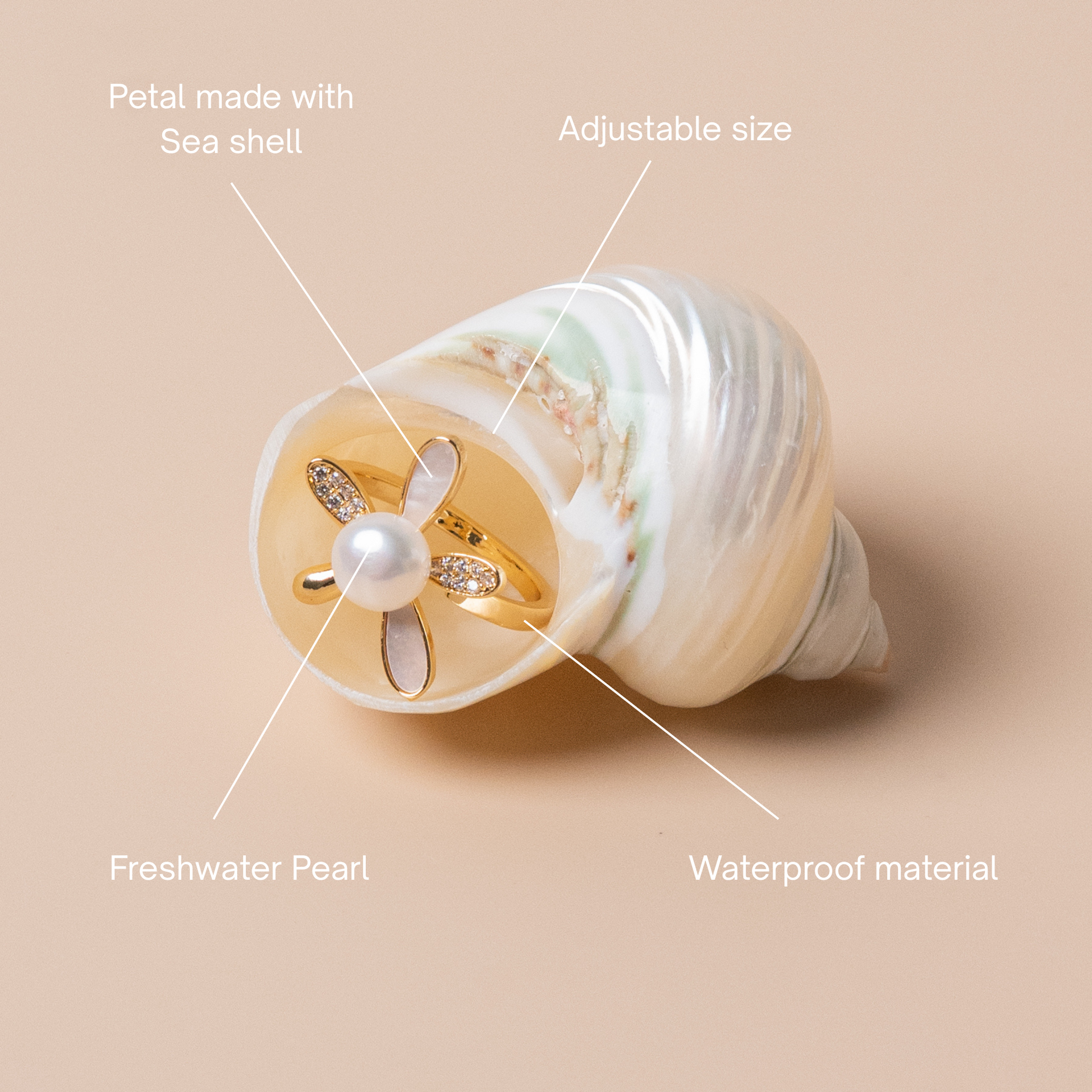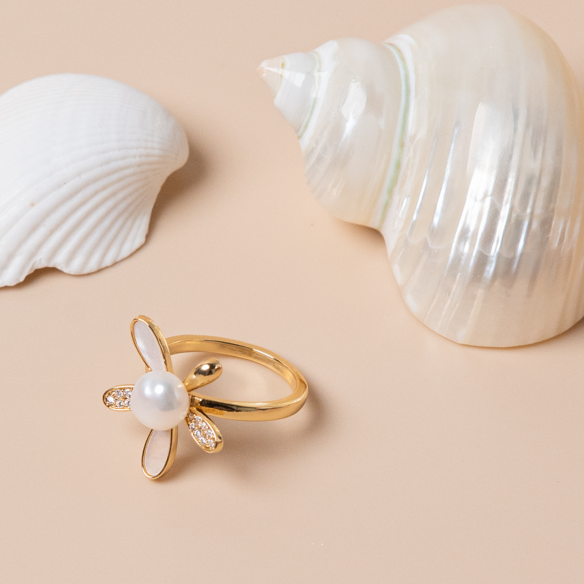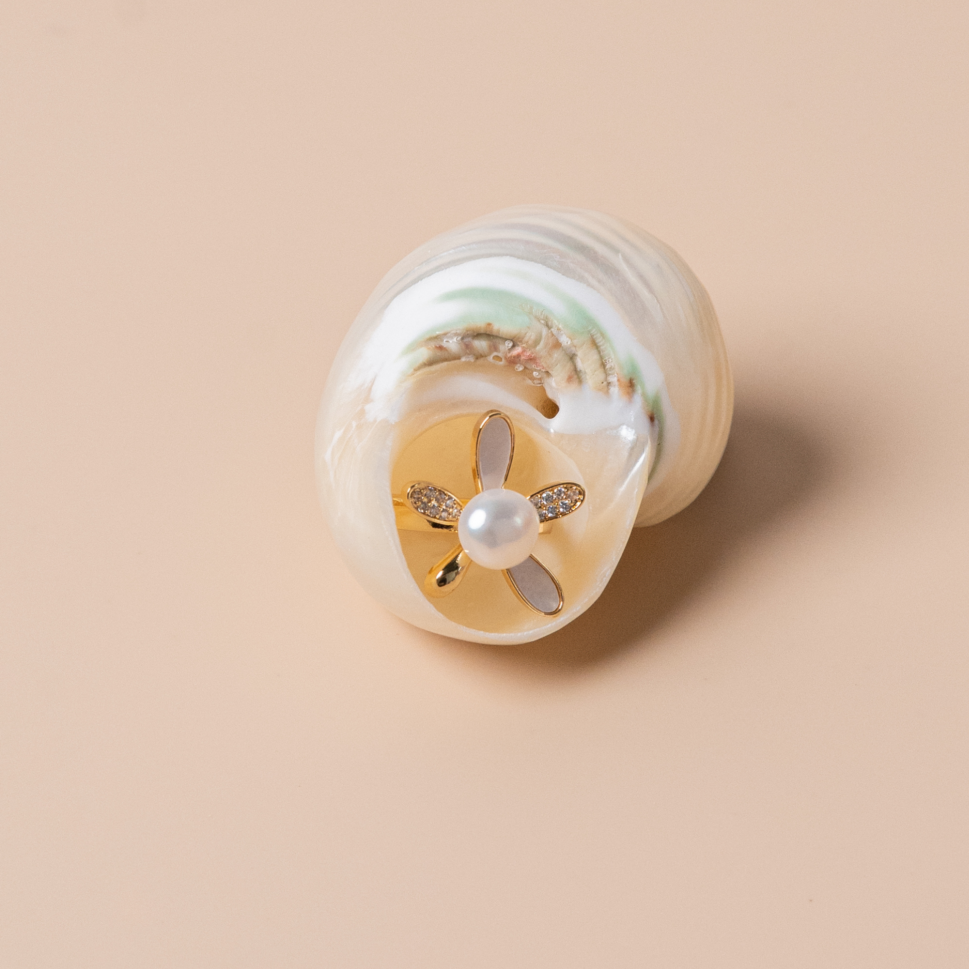 • 14 K gold-plated brass; sea shell, freshwater pearl.