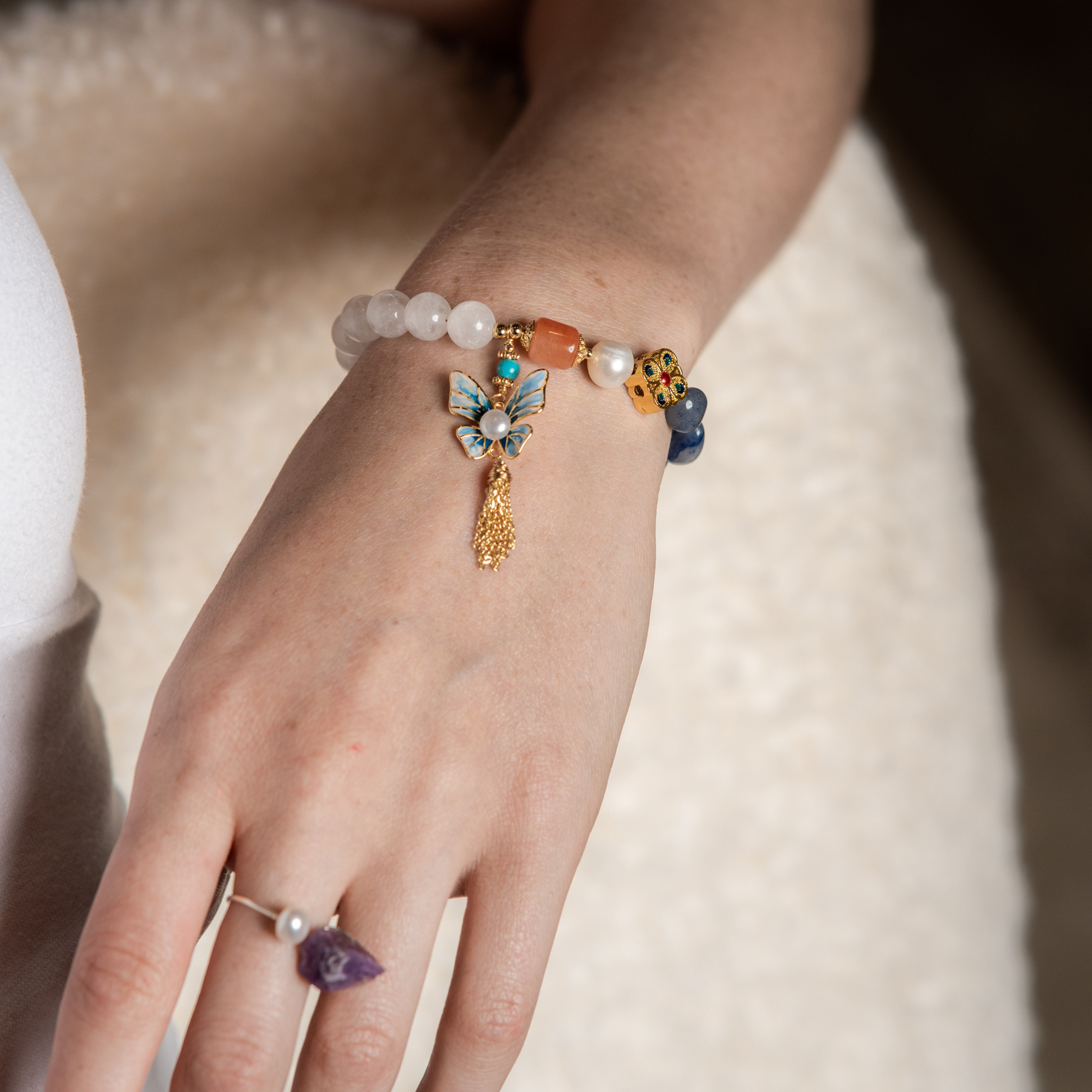 • This bracelet features a harmonious mix of natural gemstones — soothing Blue Aventurine, luminous Clear Quartz, and warm Carnelian — accented with a classic pearl and gold-tone details. A delicate butterfly charm and floral bead add a playful yet refined touch, making this piece a perfect blend of beauty, balance, and personal expression.
