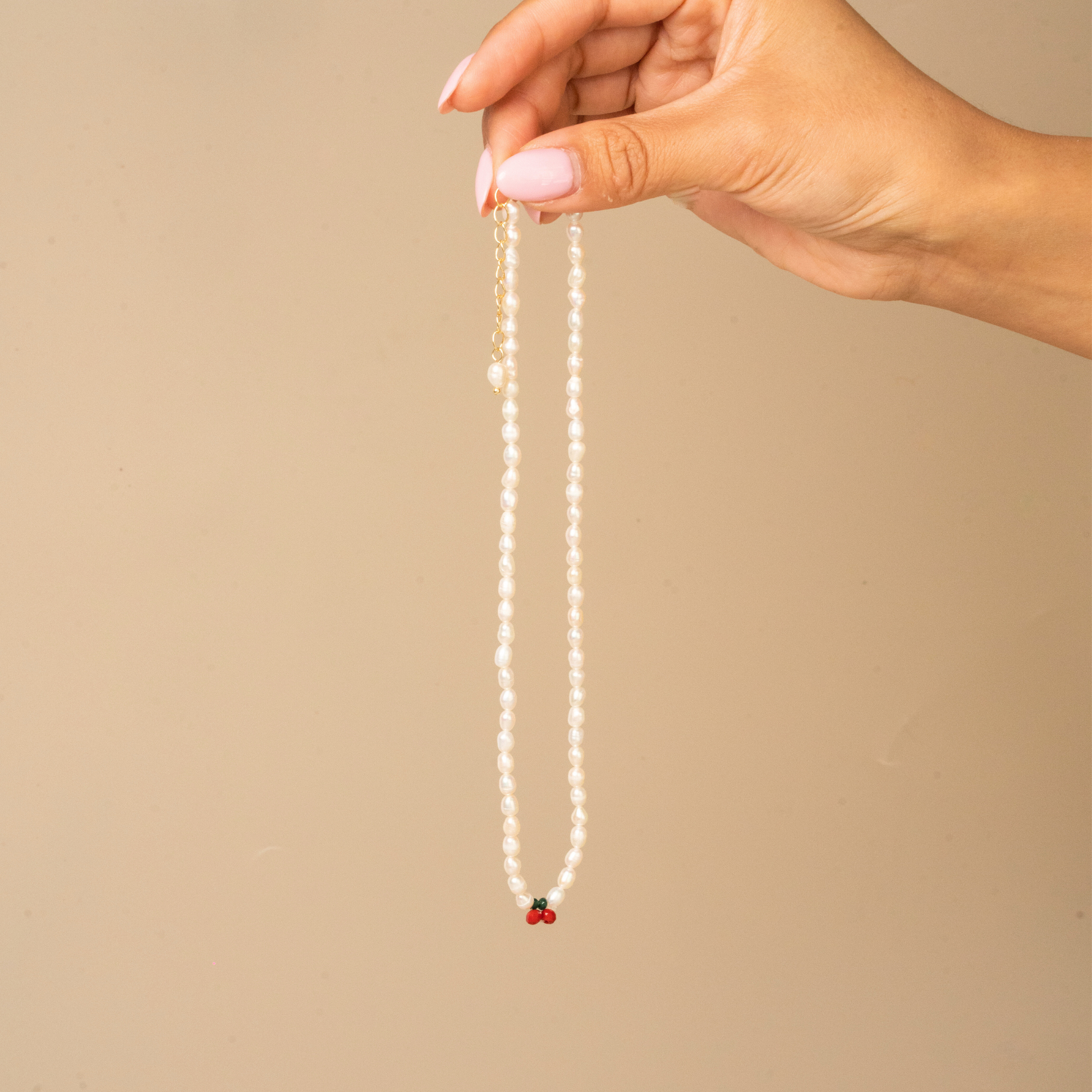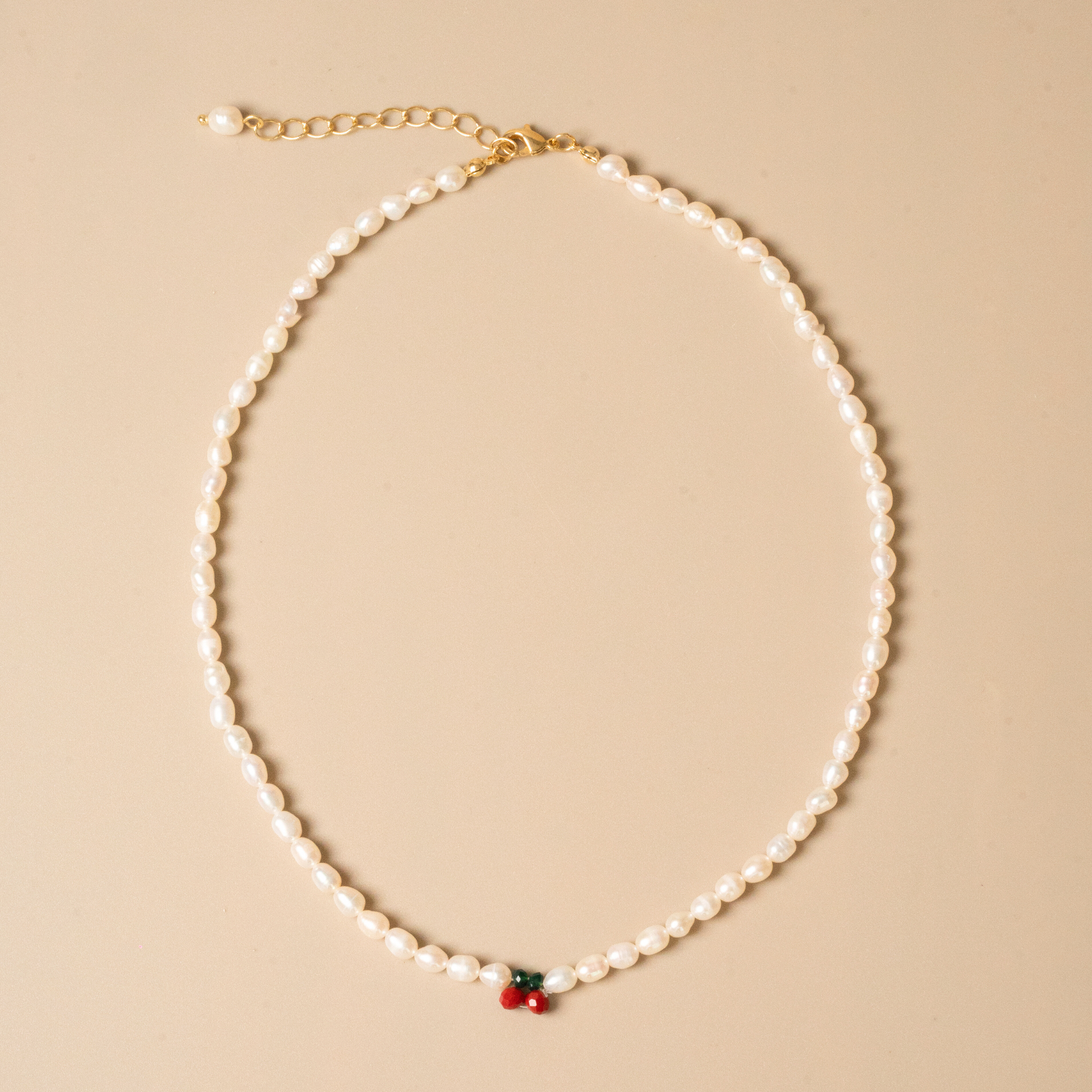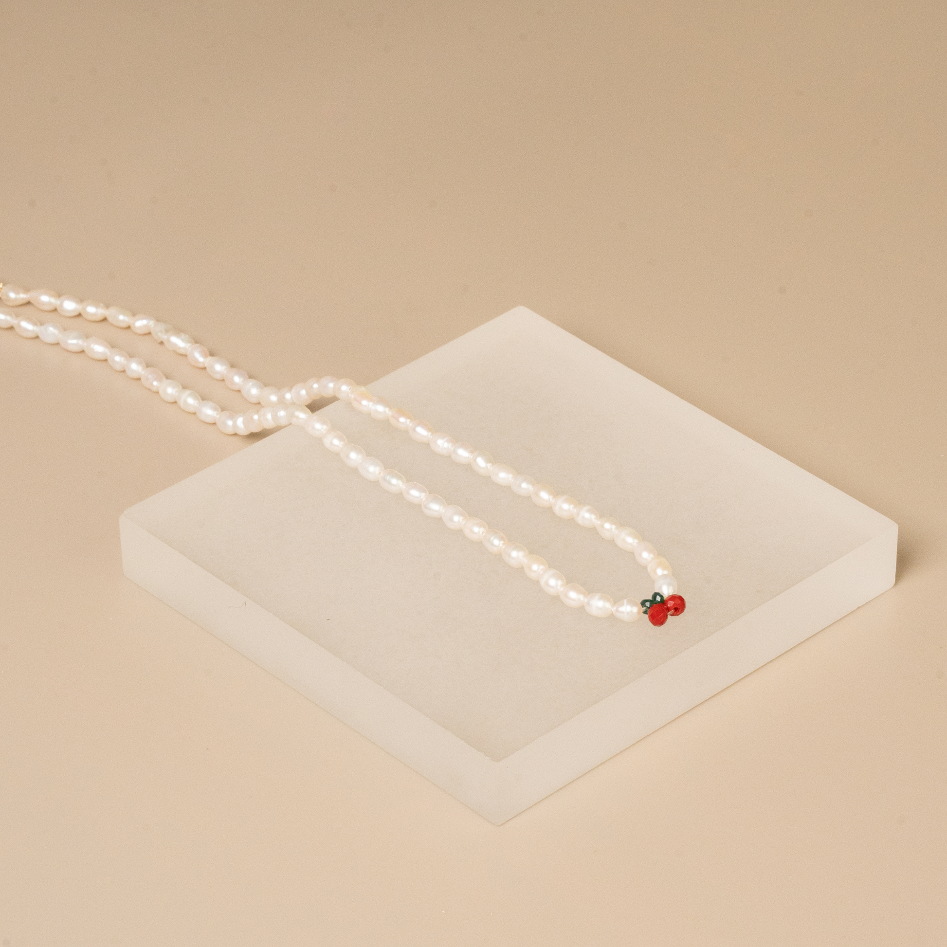 • Cherry pendant matches the freshwater pearls gives you summery vibe.