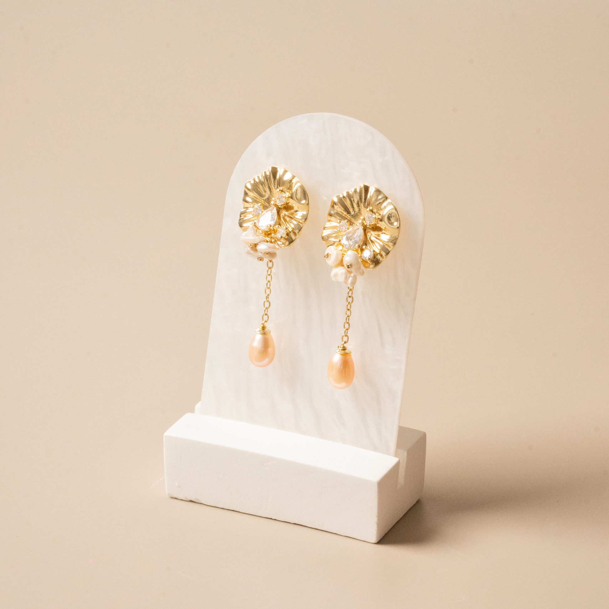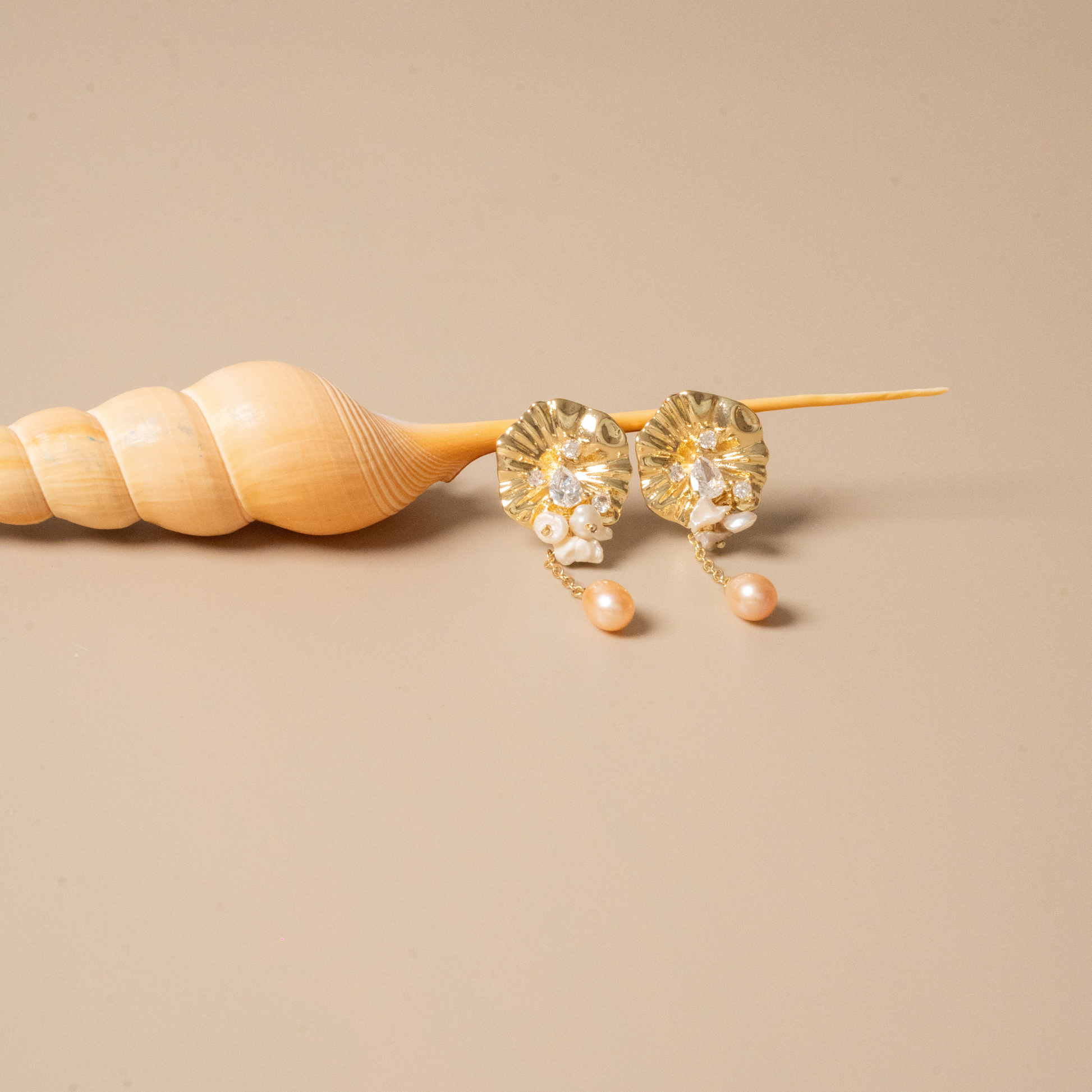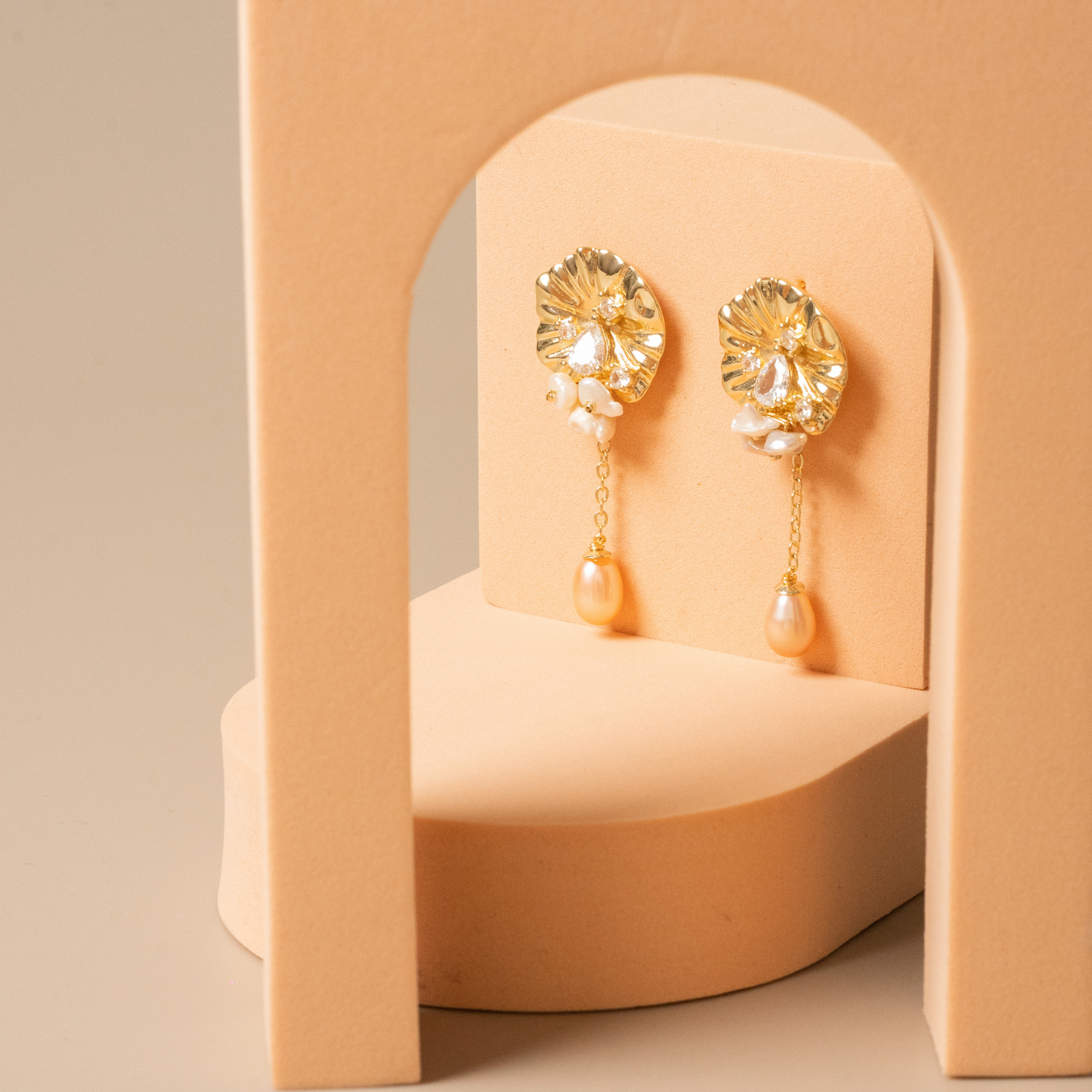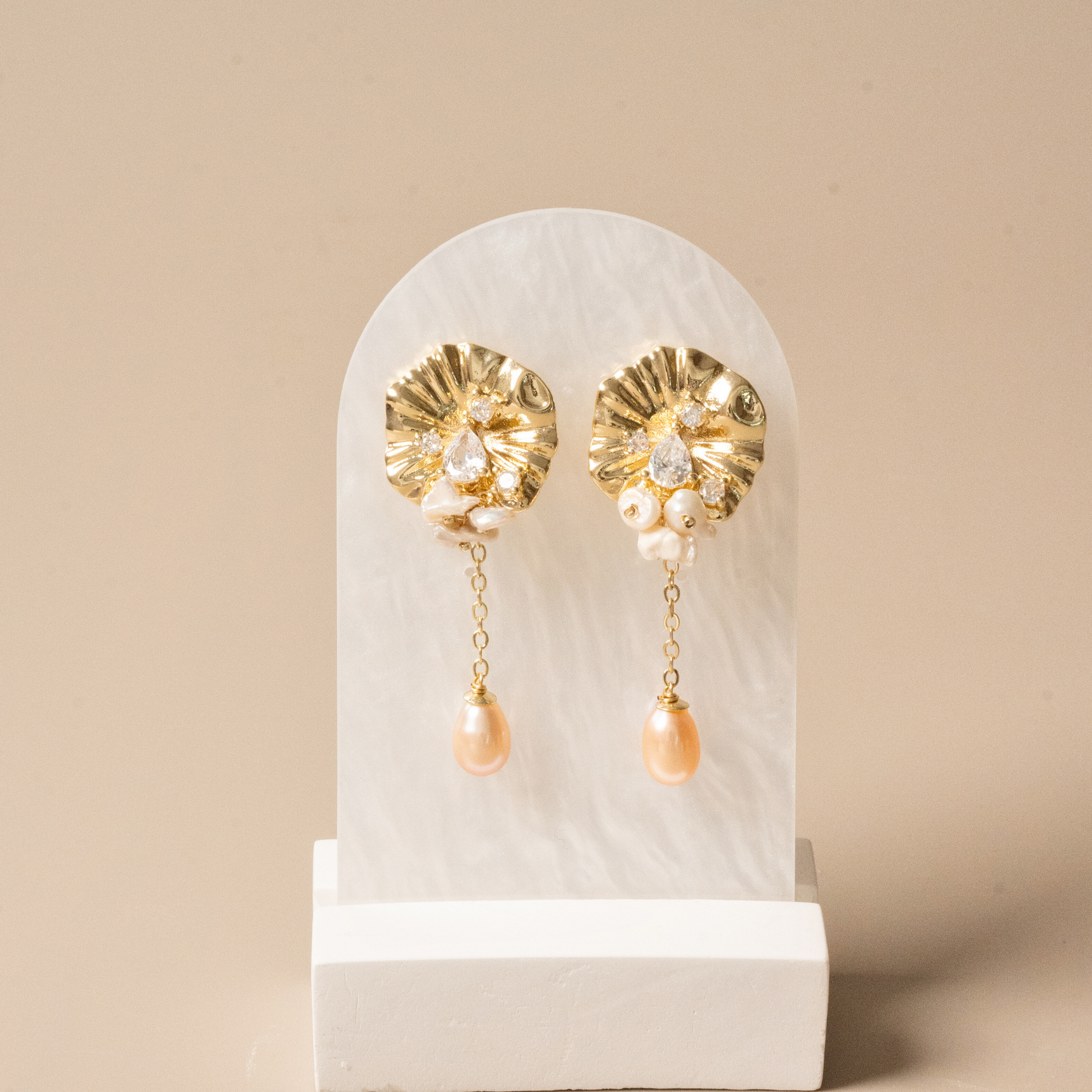 • These radiant gold statement earrings feature shimmering crystals, delicate pearls, and a soft peach color pearl drop pendant. Designed to capture light and movement, they bring a touch of luxury and romance to any outfit—perfect for special occasions or elevating your everyday style.