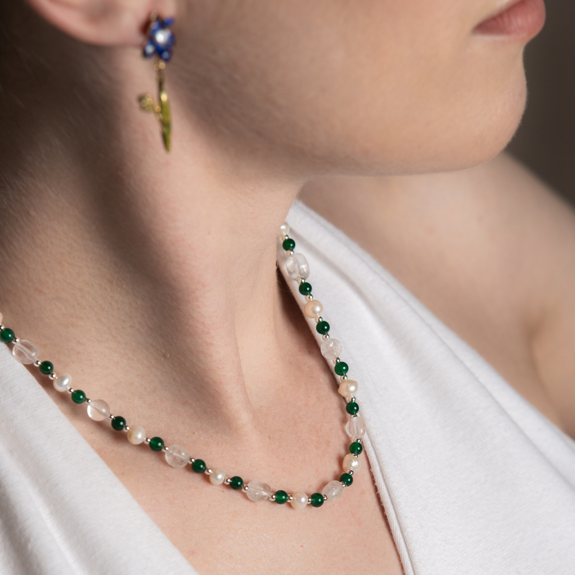 • Gemstones: clear quartz, freshwater pearls, green agate stones.