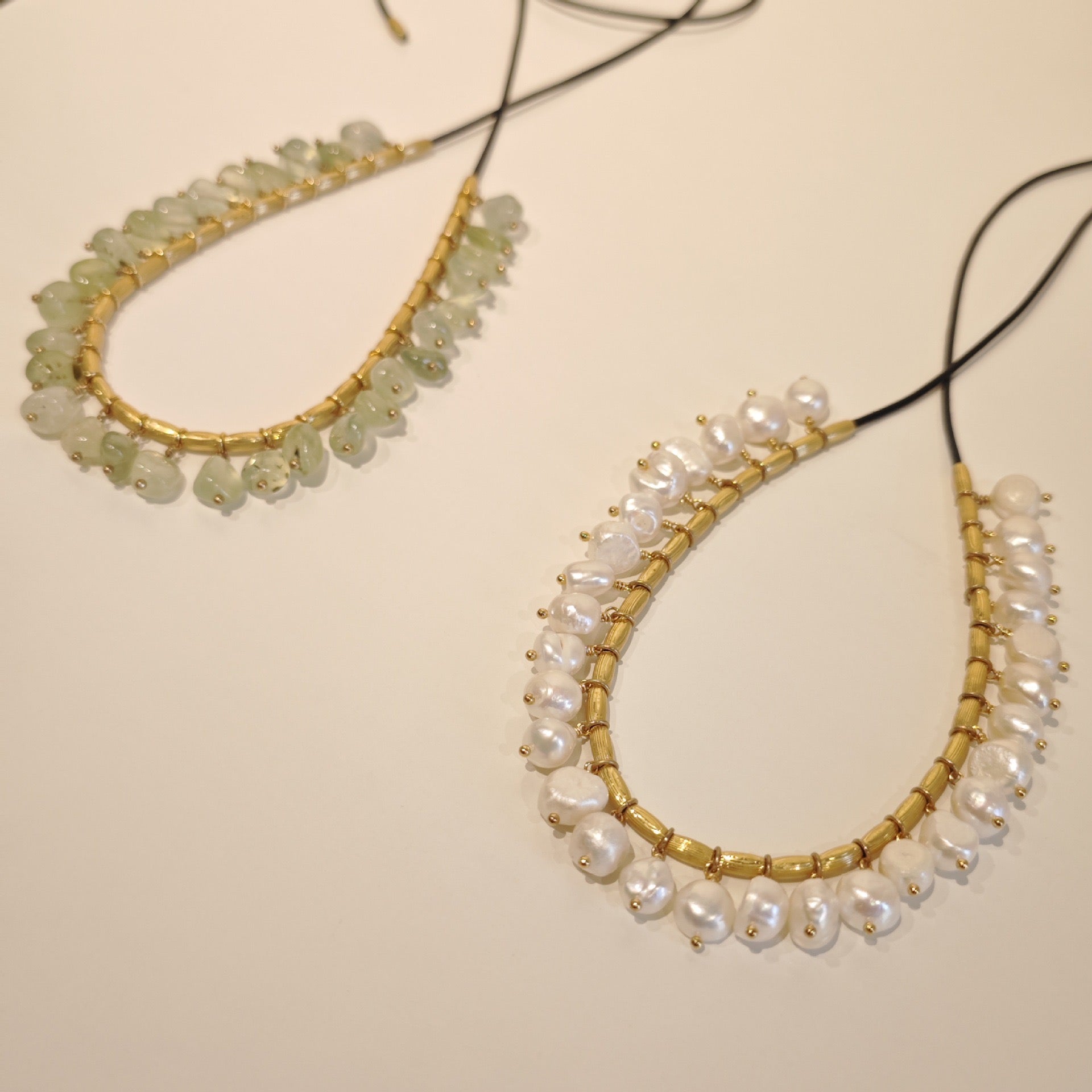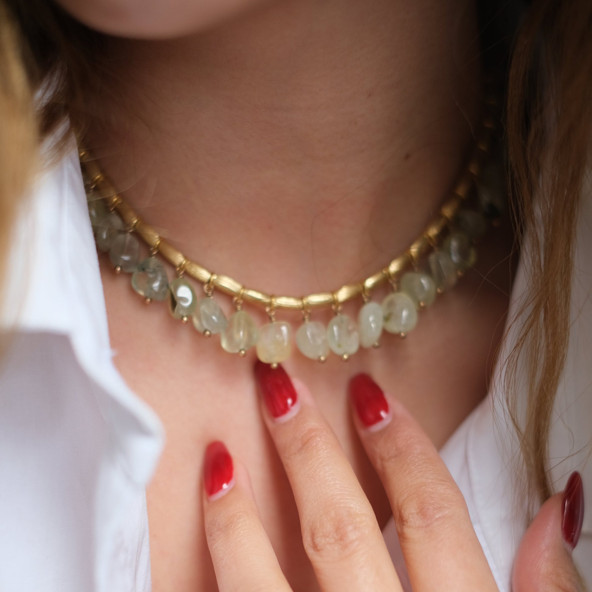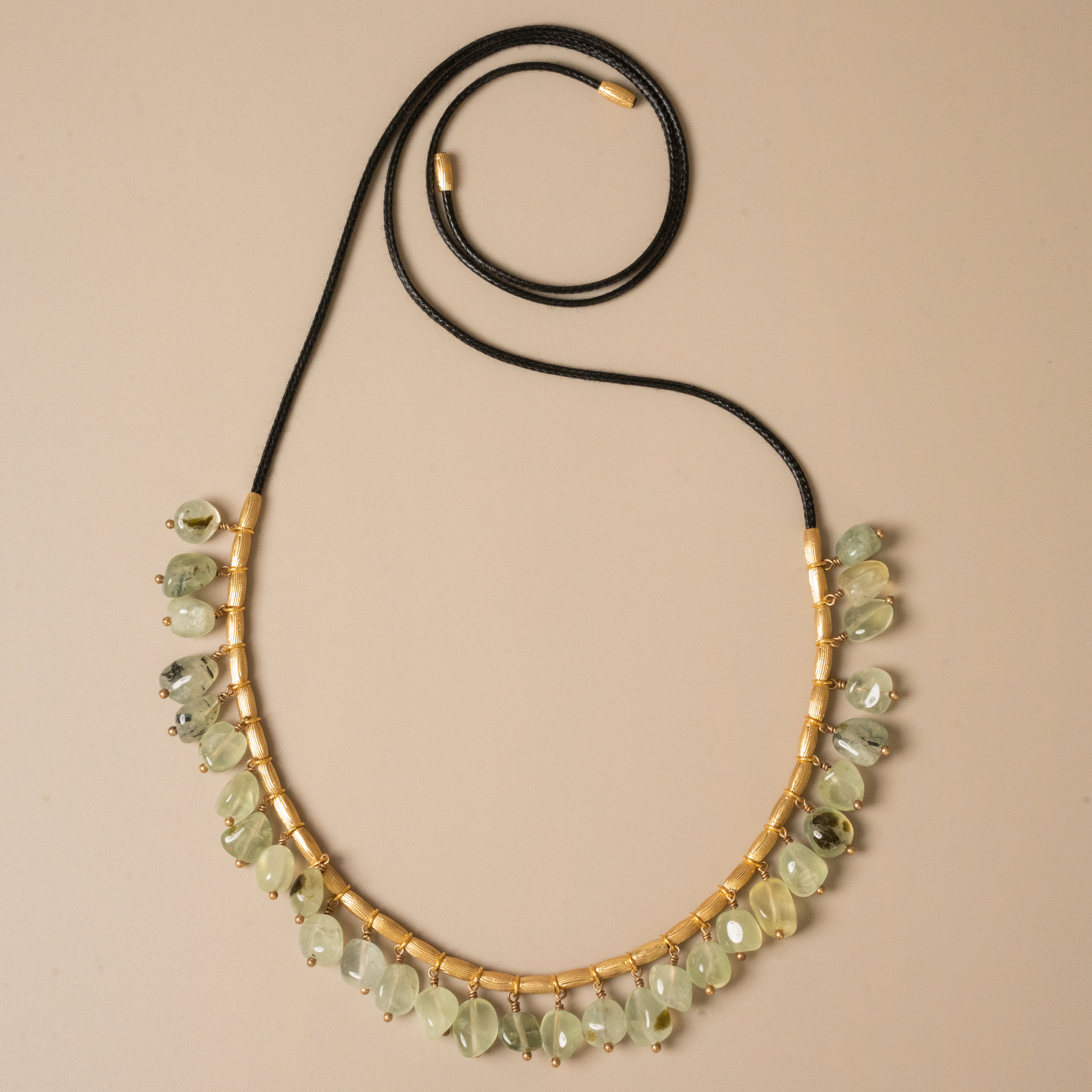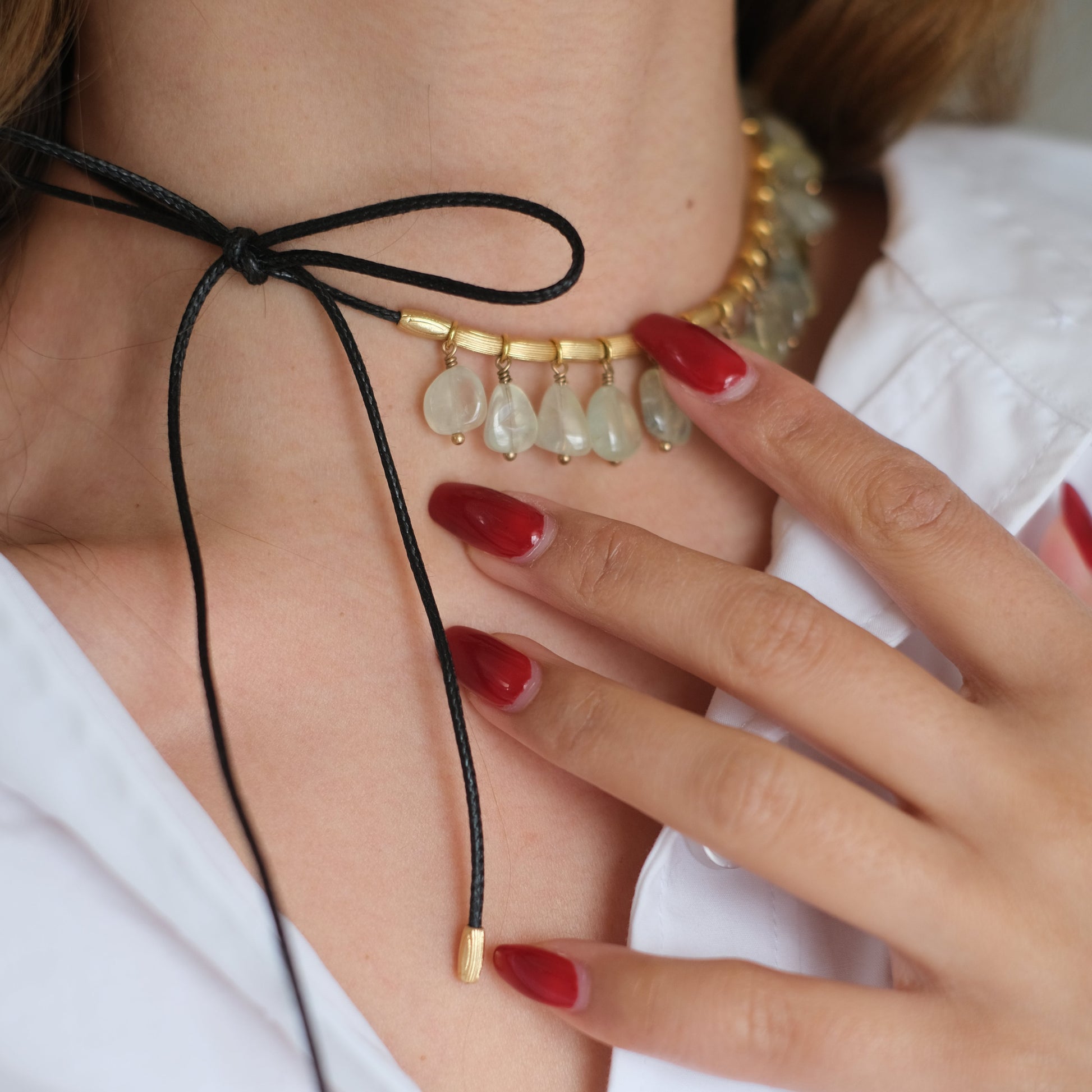 • This Prehnite stone necklace combines soft green gemstones with golden accents and a sleek black tie closure, blending elegance with a touch of modern edge. Known as the stone of healing and harmony, Prehnite brings a calming energy while making a bold style statement. Perfect for those who want jewelry that feels both meaningful and effortlessly chic.