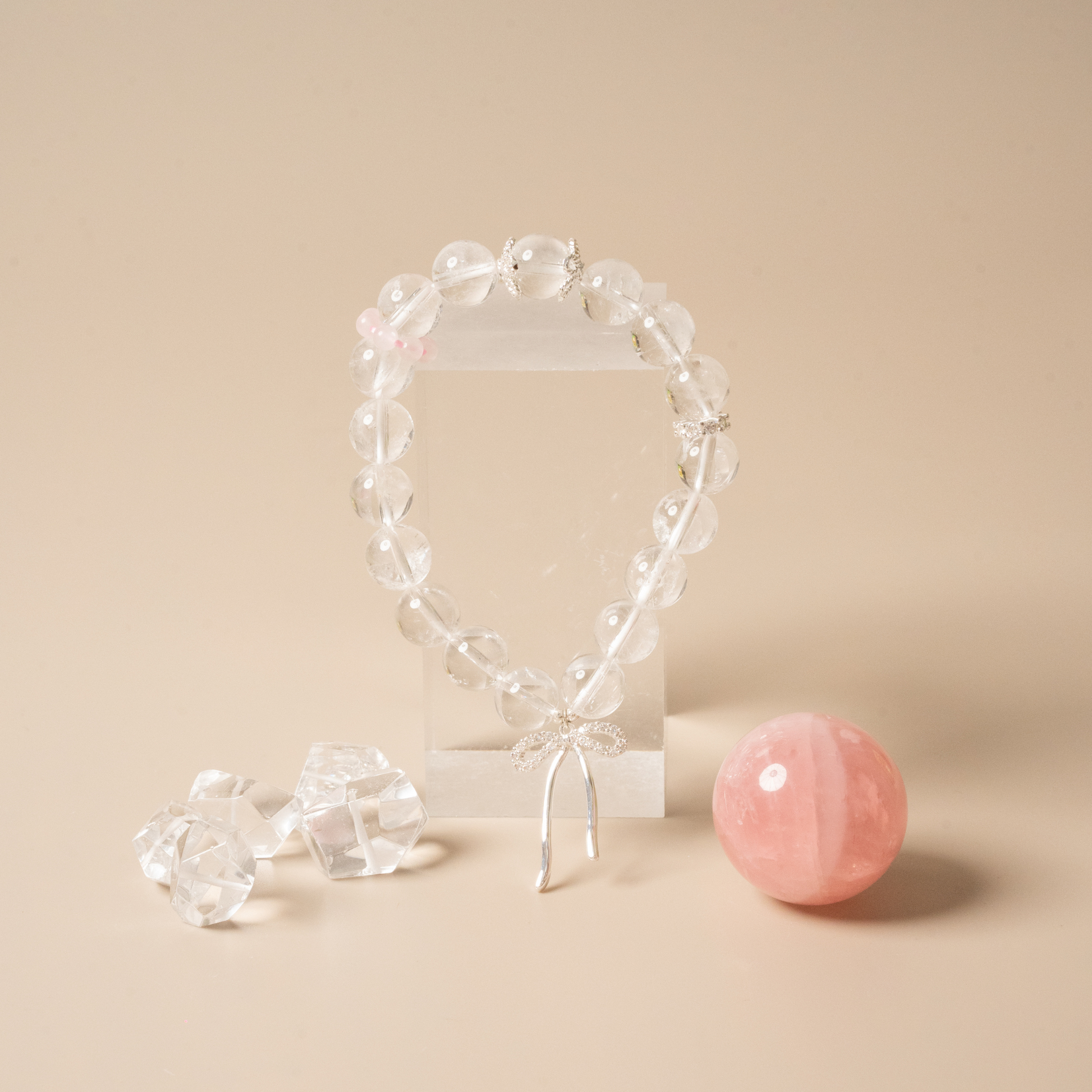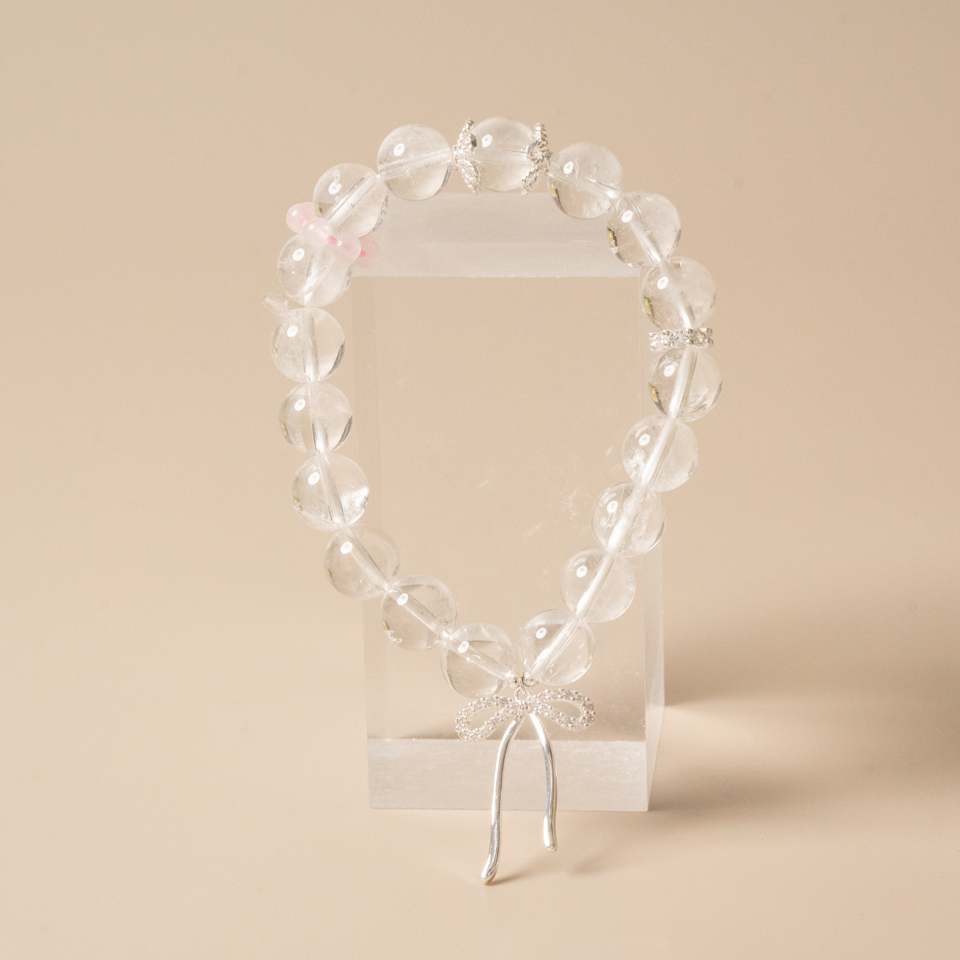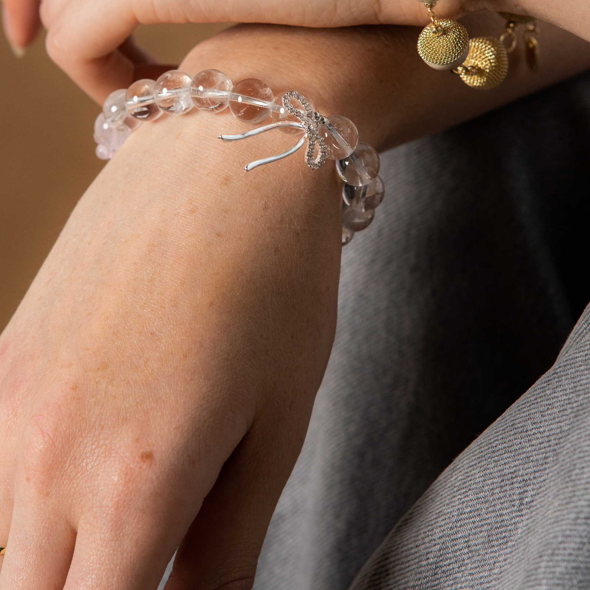 • This delicate bracelet showcases shimmering clear quartz beads accented with a charming bow pendant, adding a touch of playful elegance. Light and graceful, it's perfect for both everyday wear and special occasions.