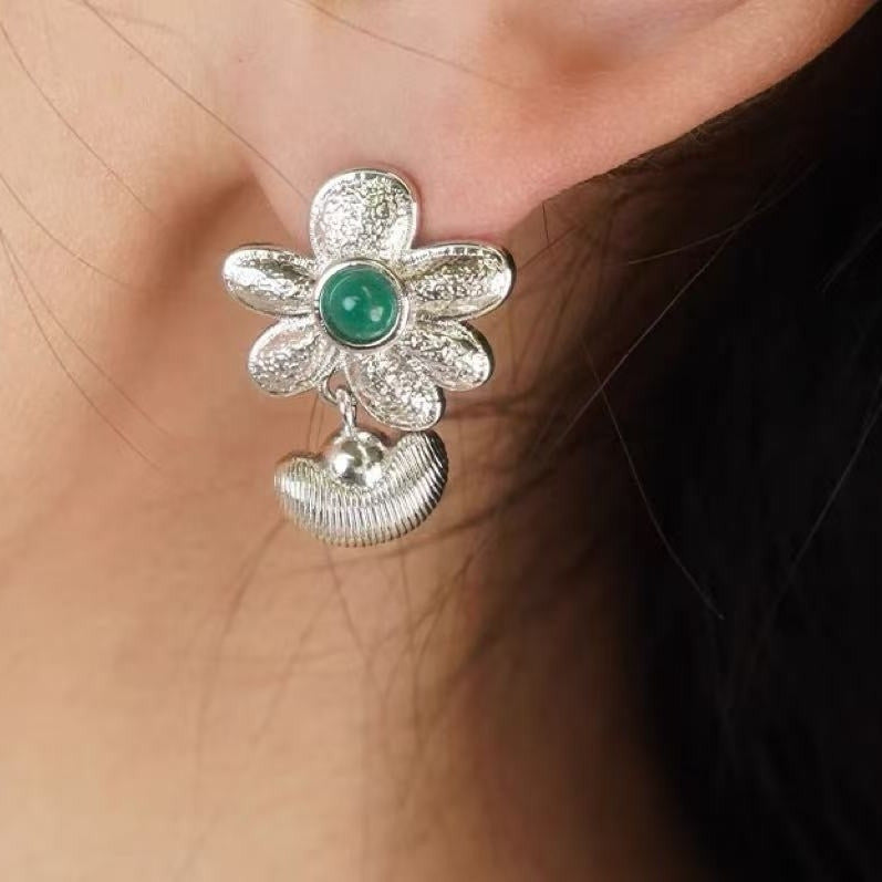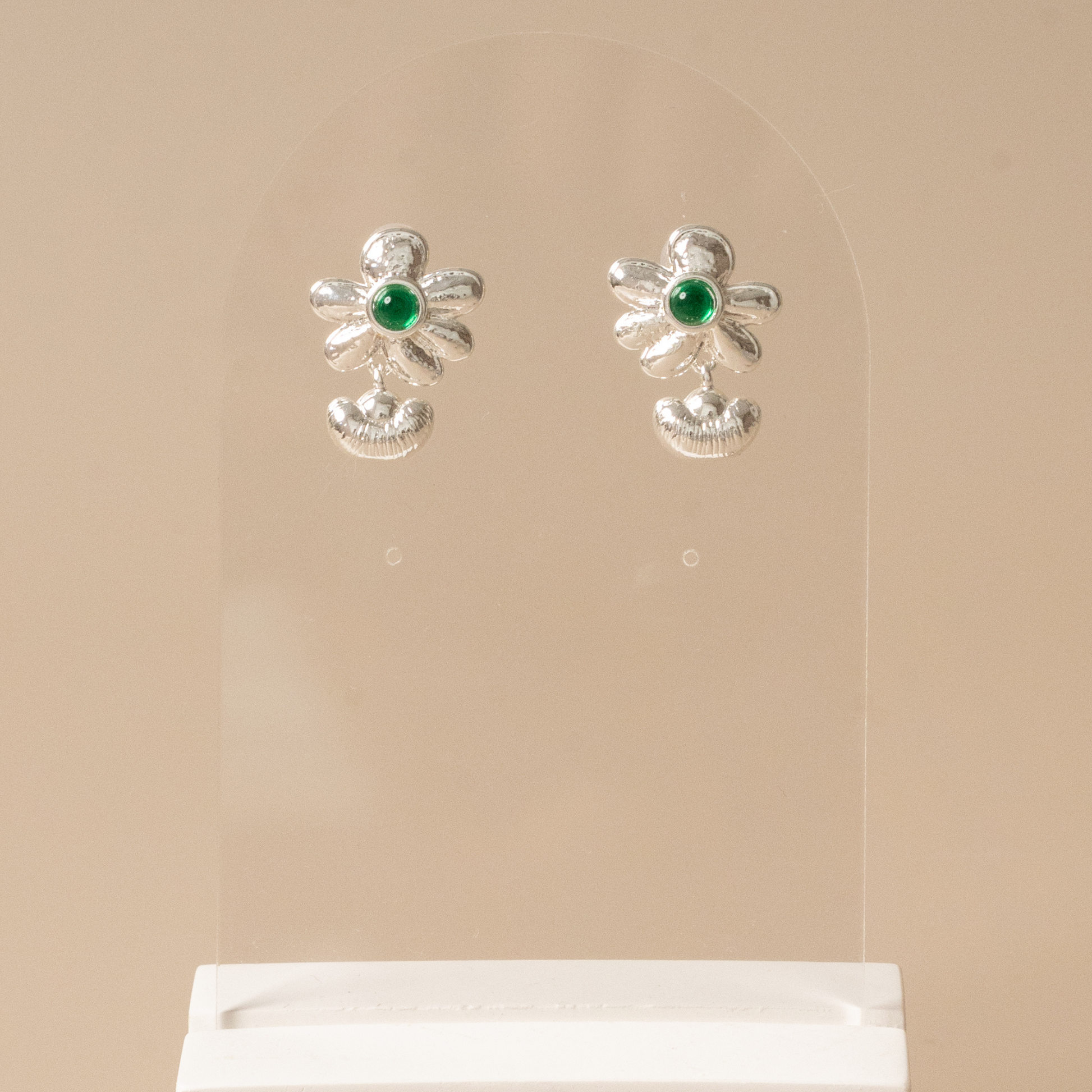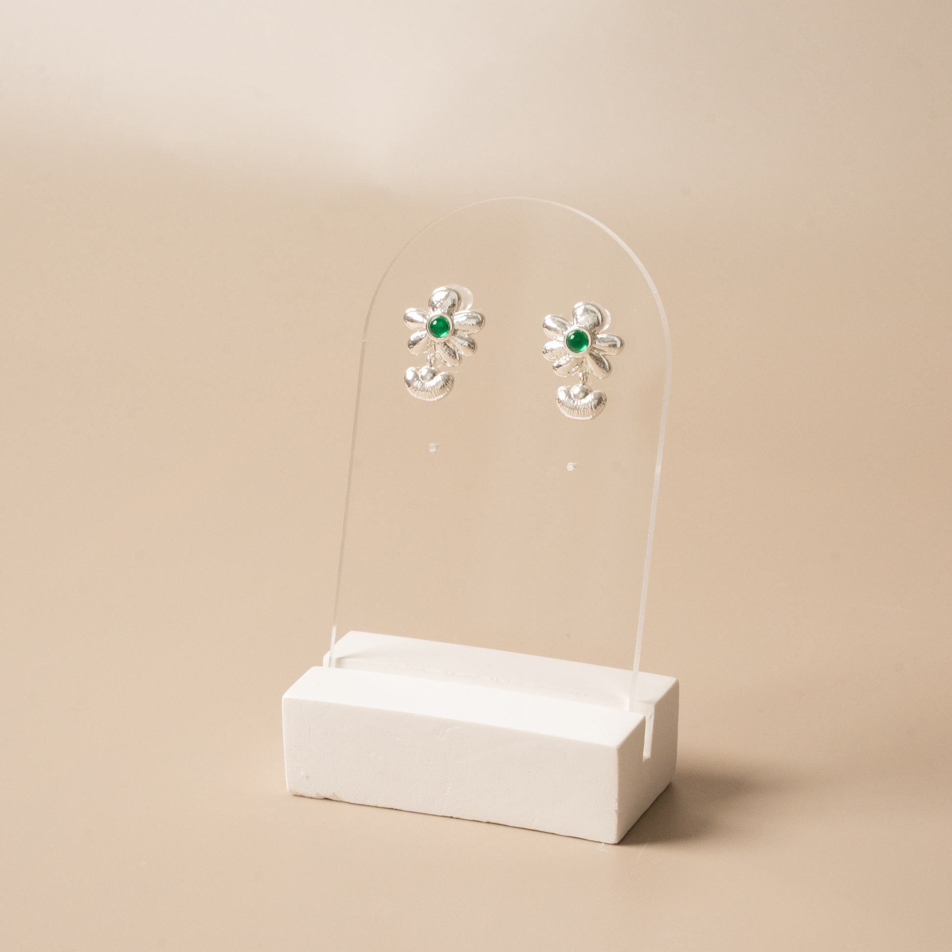 • These handcrafted silver earrings feature a delicate floral design, accented with a vibrant green stone at the center for a fresh, timeless touch. The playful petal shape and subtle shine make them perfect for adding elegance to both everyday outfits and special occasions. Lightweight yet eye-catching, they bring a graceful charm that feels both modern and classic.