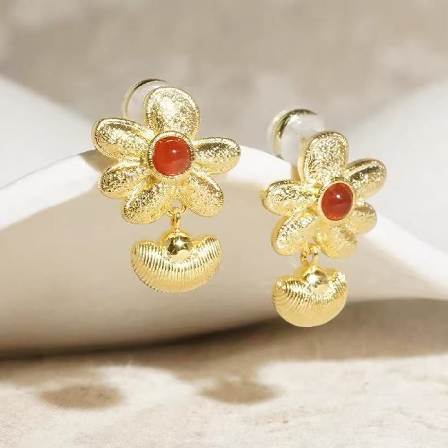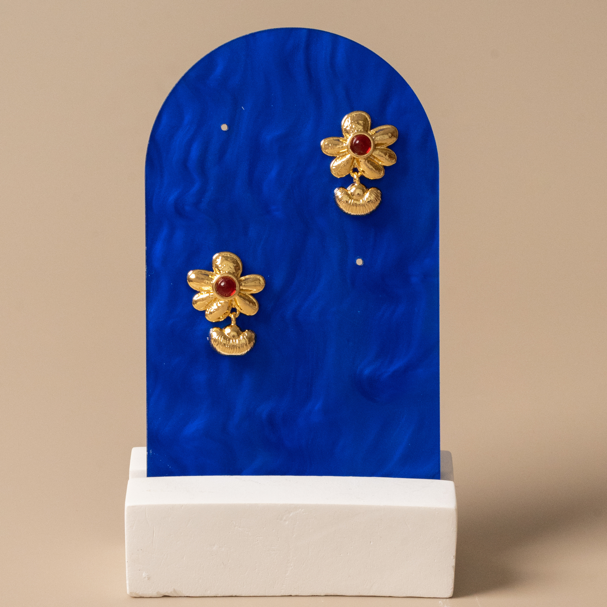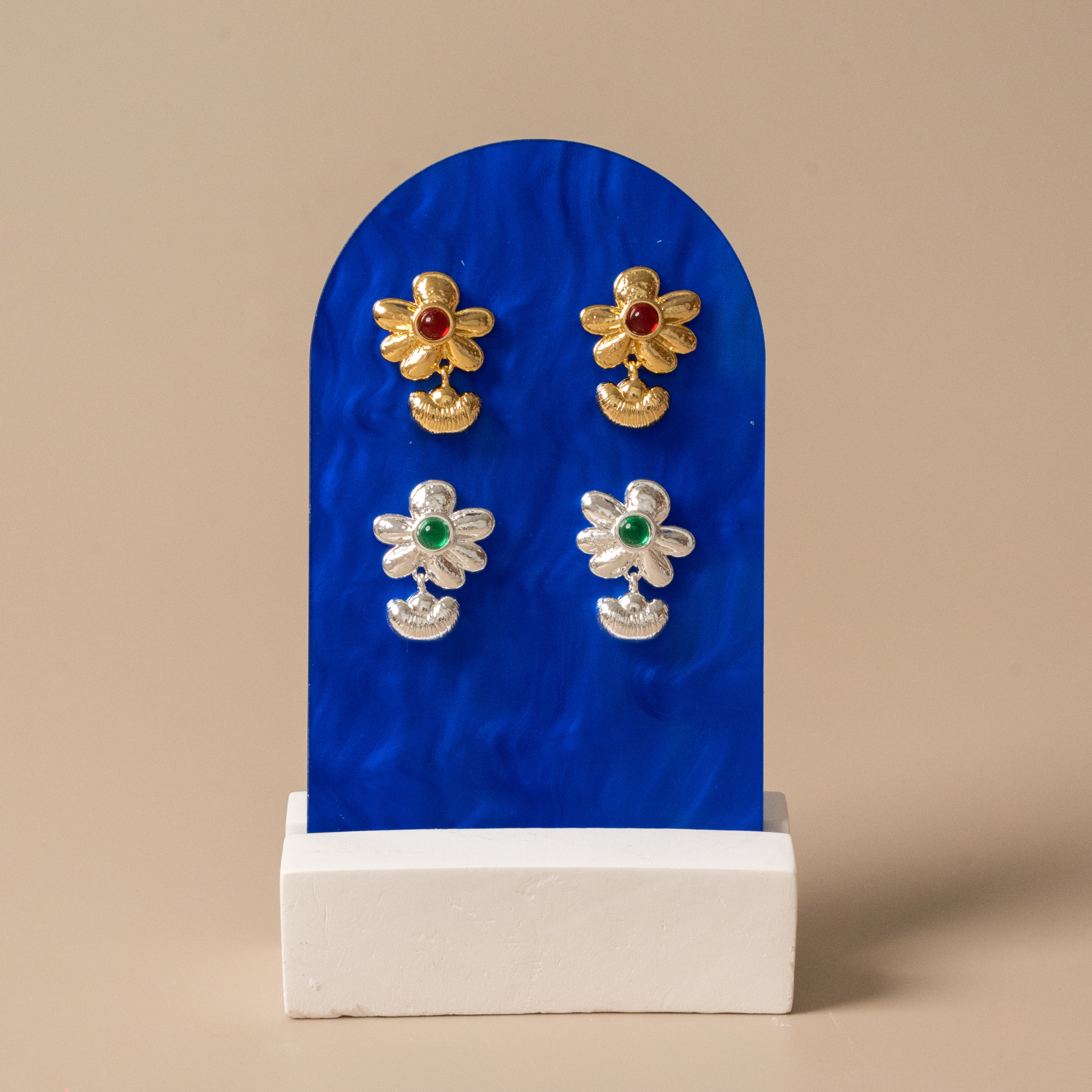 • These handcrafted silver earrings feature a delicate floral design, accented with a vibrant green stone at the center for a fresh, timeless touch. The playful petal shape and subtle shine make them perfect for adding elegance to both everyday outfits and special occasions. Lightweight yet eye-catching, they bring a graceful charm that feels both modern and classic.