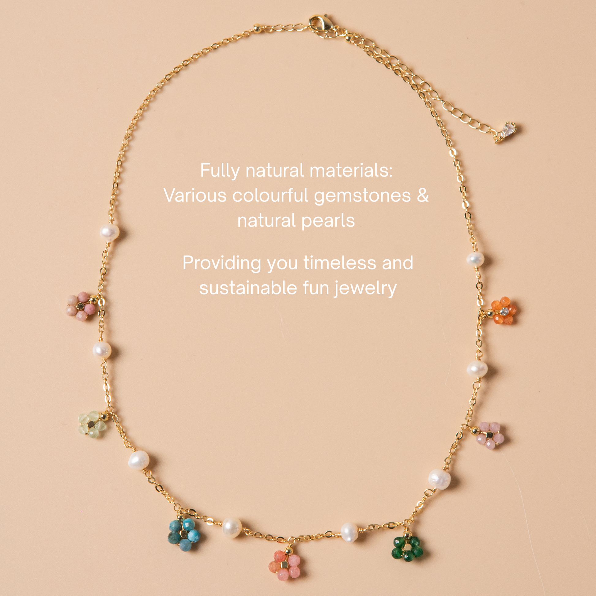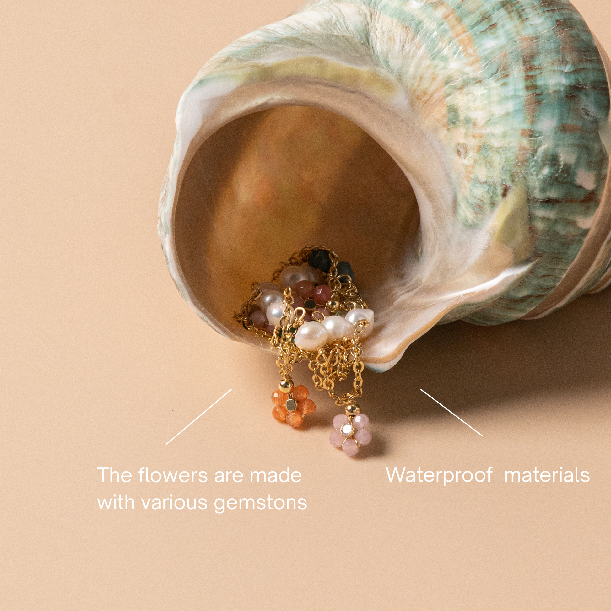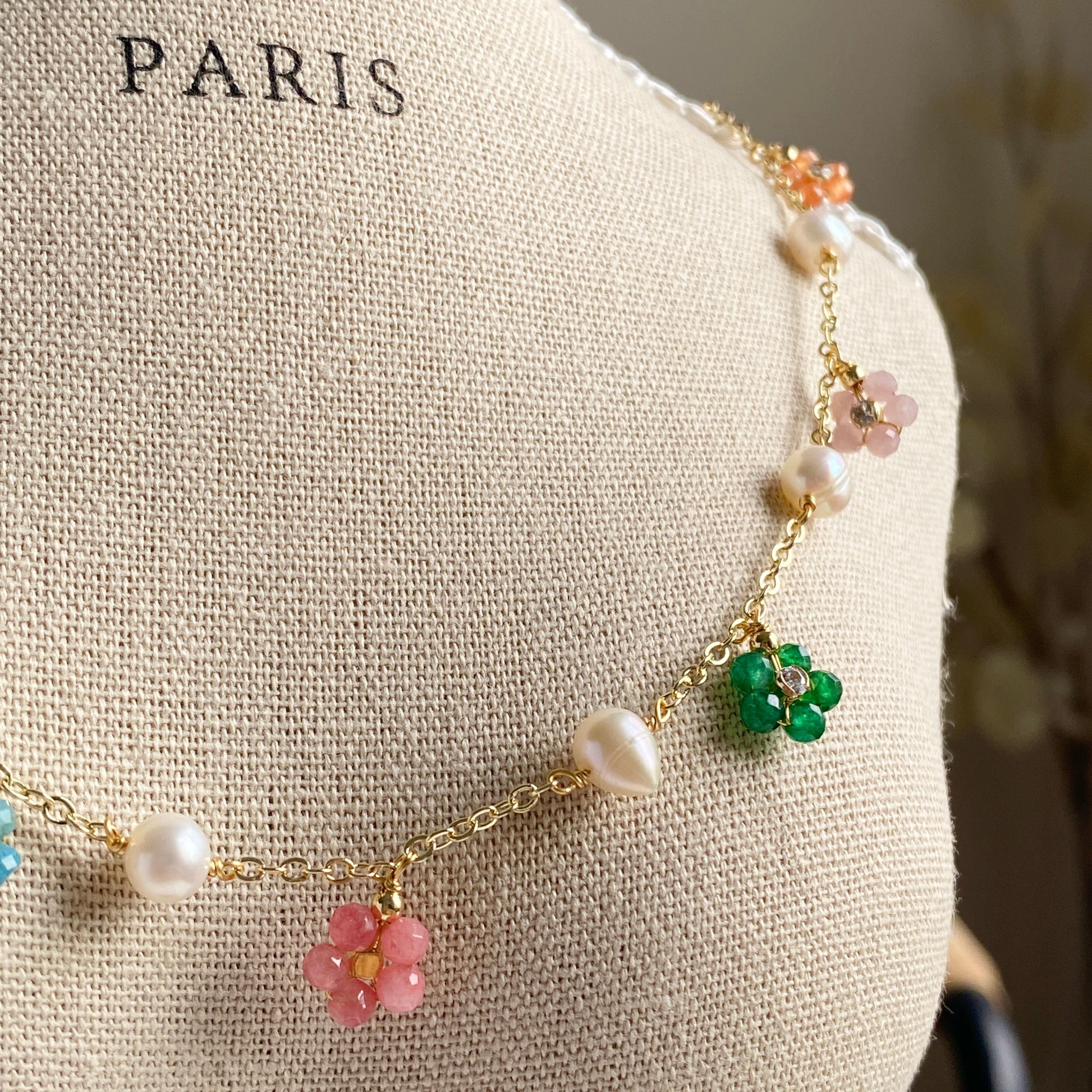 • Different coloured tiny gems are used to create small flowers, paired with freshwater pearls to enhance the summery atmosphere.