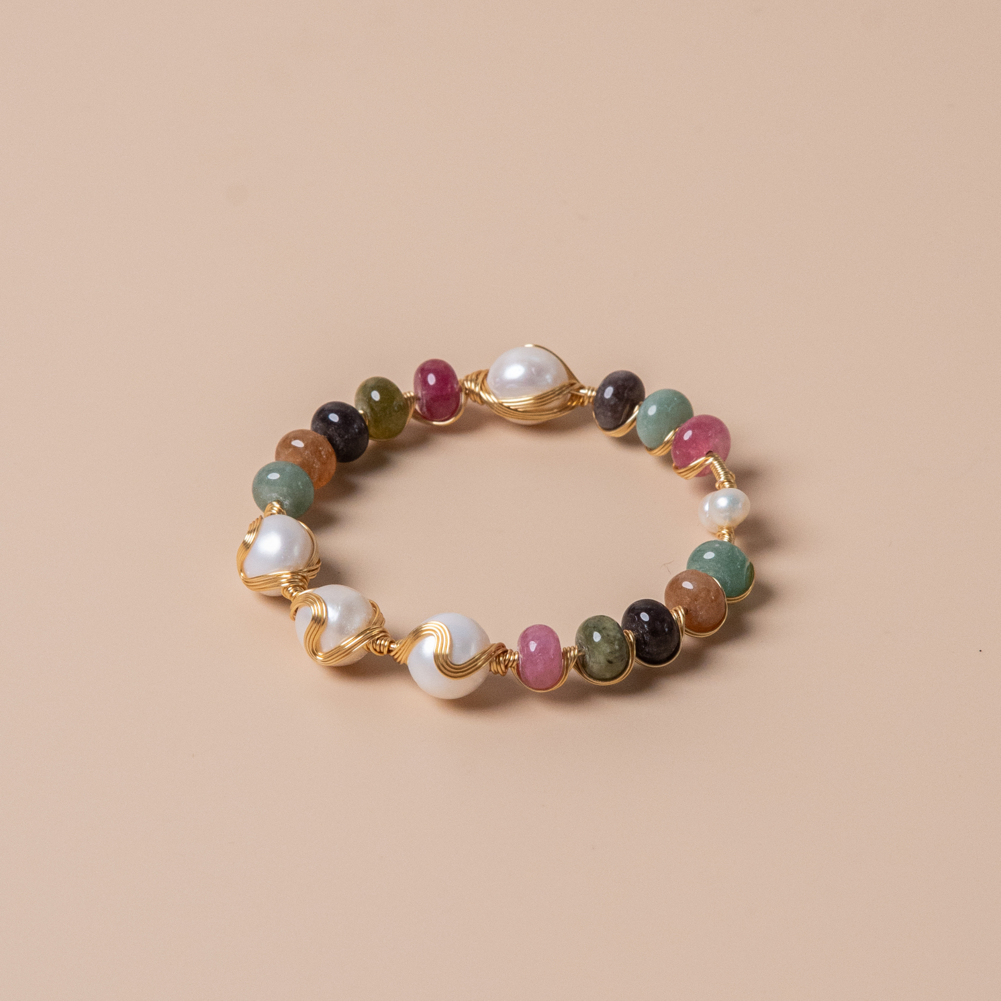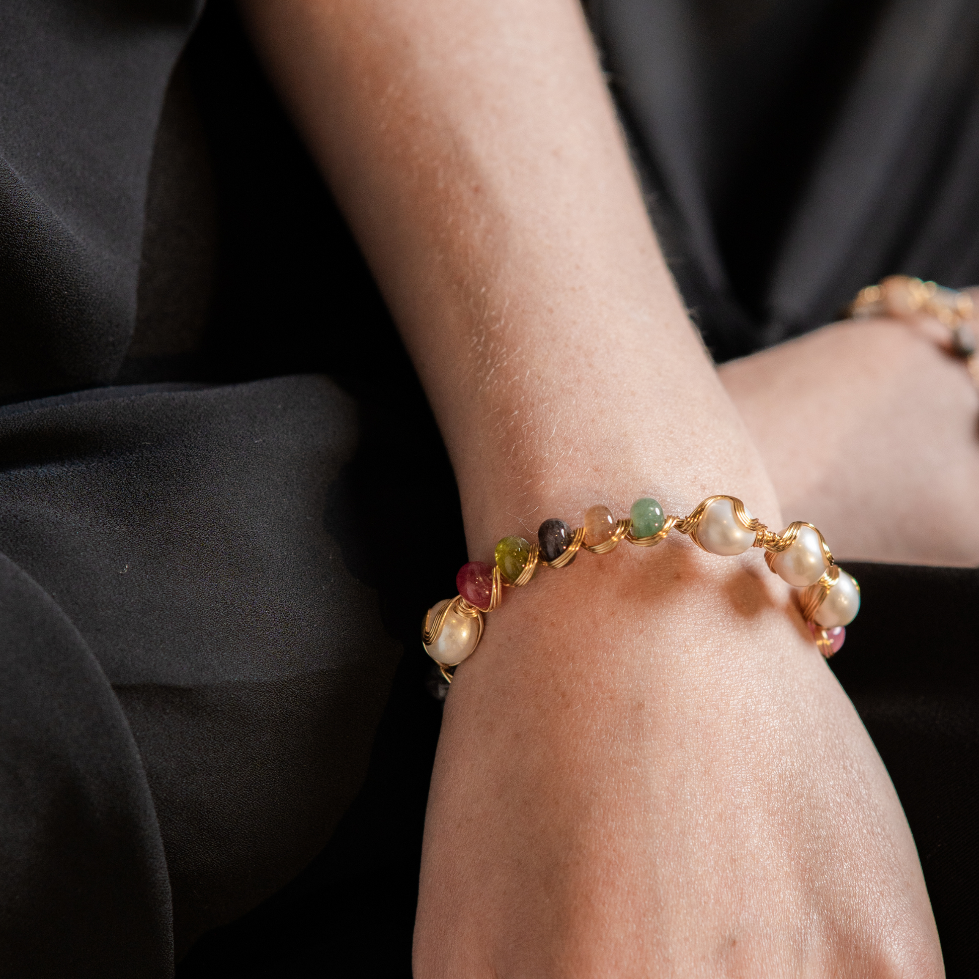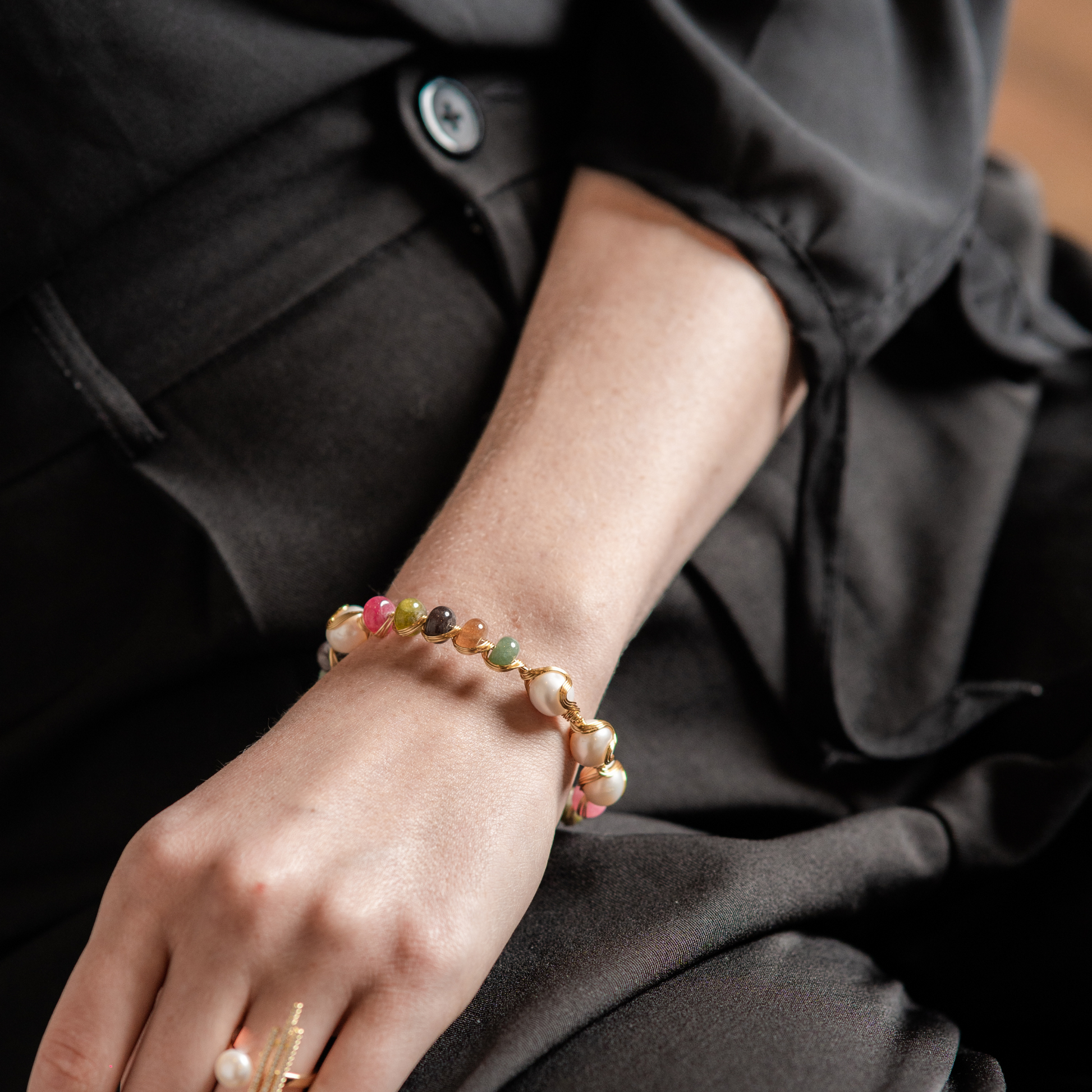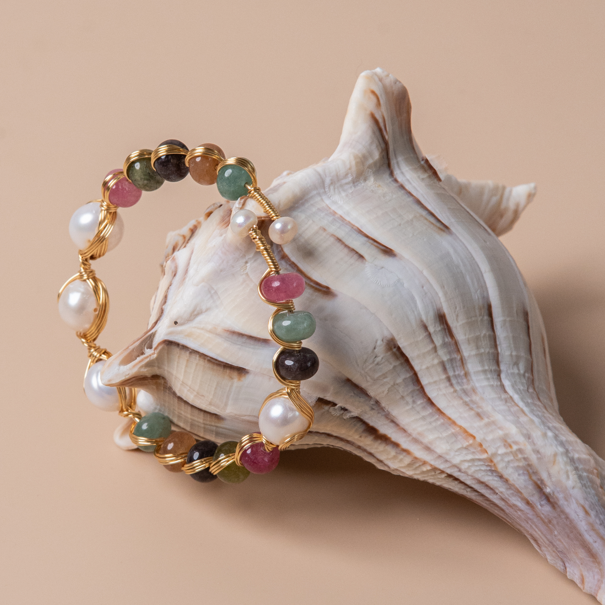 • Natural materials: tourmaline stones; freshwater pearls; 18k gold-plated brass.